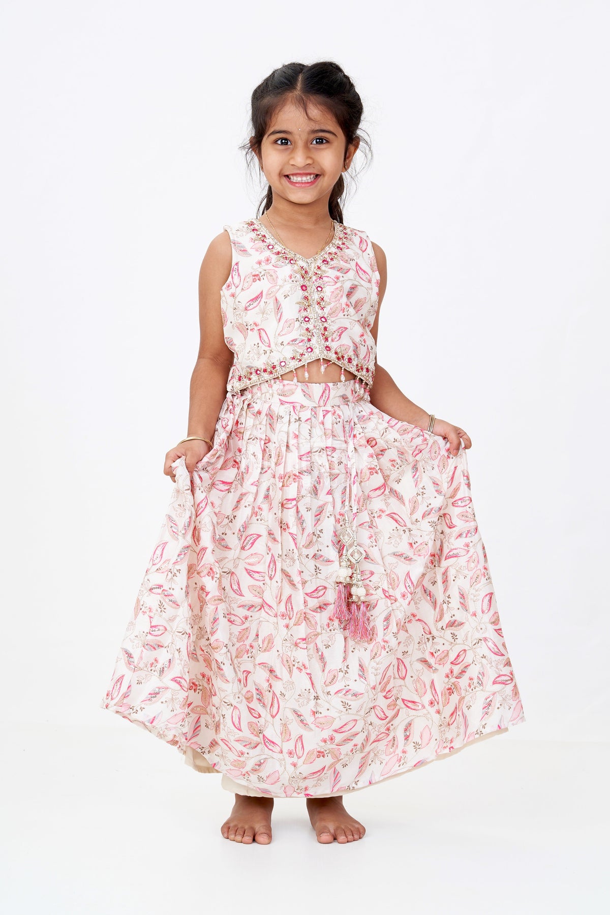 This breathtaking shadi lehenga is designed to make your little girl shine at any wedding or festive occasion. Made from luxurious pure muslin silk, the lehenga showcases an elegant ivory base with intricate pink floral embroidery, adding a delicate and graceful touch. The sleeveless choli is adorned with shimmering embellishments, while the flared lehenga features beautifully crafted tassel details for a playful yet sophisticated look. A sheer dupatta with tassel embellishments completes the outfit, making it a perfect choice for grand celebrations.