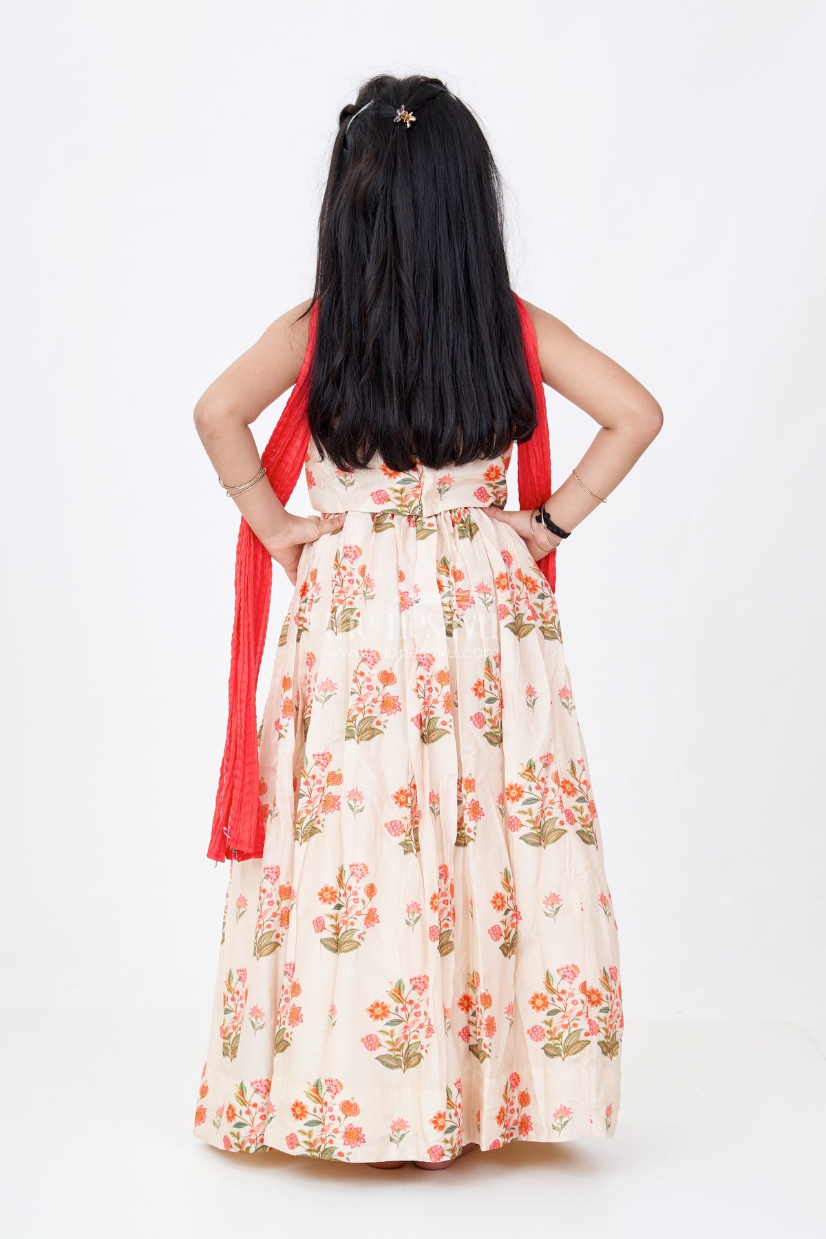 Classic elegance meets everyday comfort in this cotton lehenga choli with dupatta, beautifully crafted in viscose silk with digital floral print and mirror embroidery. The soft beige-toned fabric is adorned with red and green floral motifs, while the mirror work on the choli adds a dash of sparkle. The set includes a matching lehenga skirt and a red dupatta, making it a ready-to-wear festive outfit. Designed with tassel accents and adjustable waist, this outfit blends tradition and versatility—ideal for cultural celebrations and family occasions.