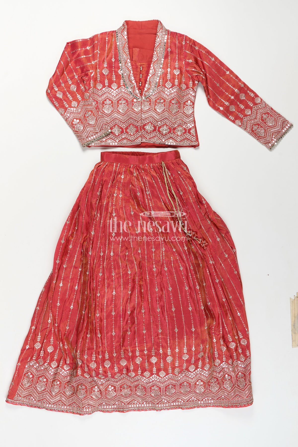 Lehenga choli red colour is a timeless statement in ethnic wear, and this set is crafted to shine. Made from premium shimmer viscose silk, the lehenga features delicate zari-inspired patterns with mirror detailing and vertical sequin embroidery. The red blouse includes a front-buttoned design and pairs seamlessly with a beautifully tailored jacket rich in designer embroidery. The flared skirt offers a full, twirl-worthy shape ideal for movement and flair. This three-piece ensemble delivers bold tradition with modern tailoring, making it an ideal choice for girls attending weddings, cultural events, or grand festivities.