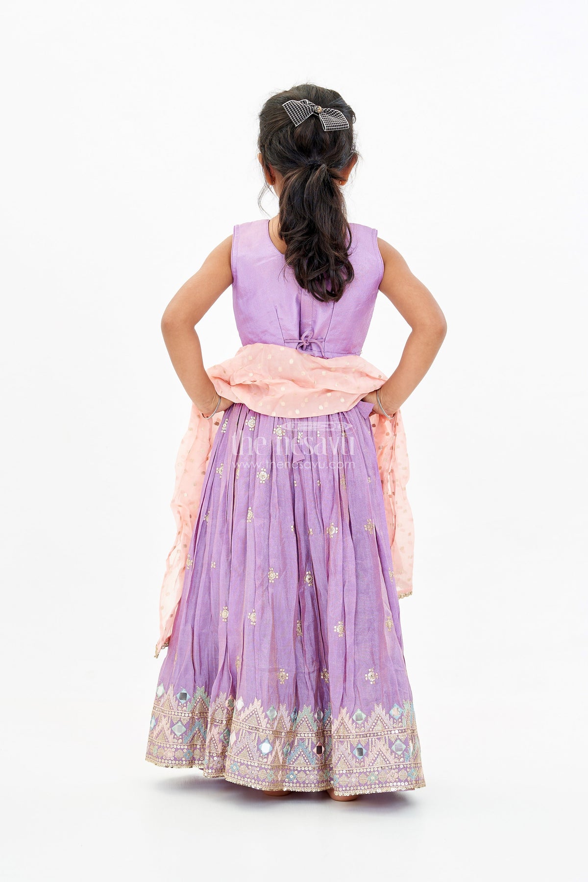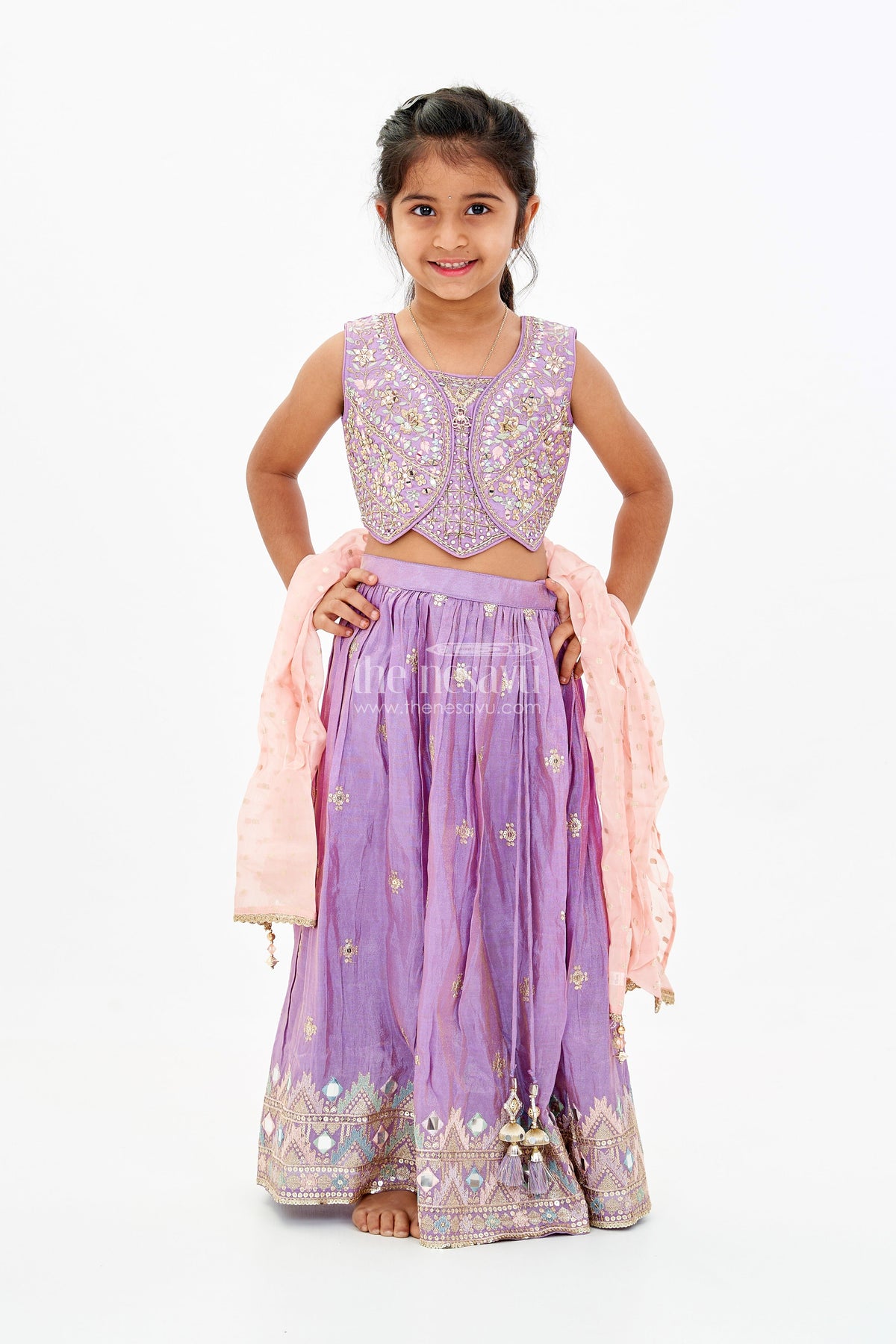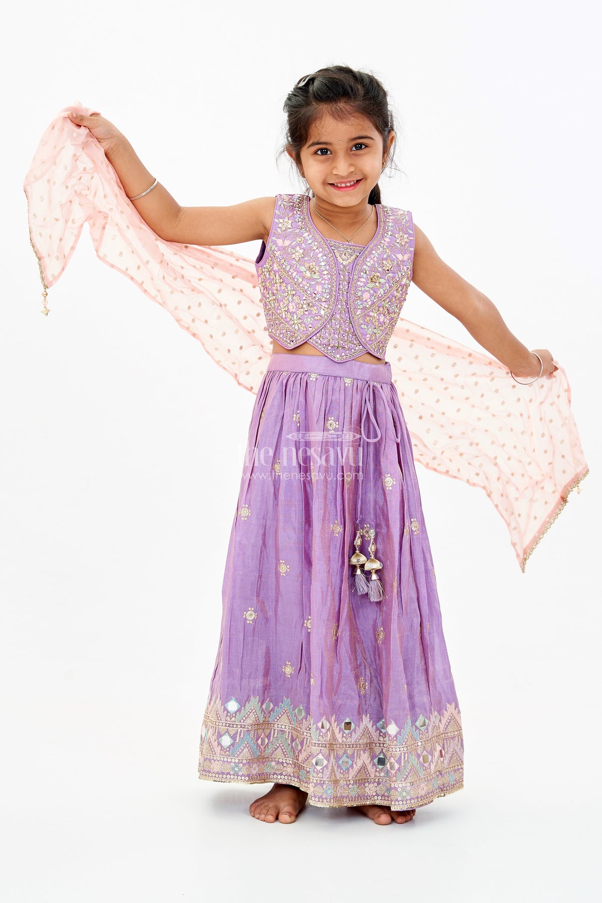 This party wear lehenga choli in rich purple is designed for special occasions like weddings, receptions, and festive gatherings. The intricately embroidered blouse features mirror and threadwork, adding a luxurious touch to the ensemble. The pleated lehenga is adorned with shimmering embellishments and a heavily detailed border, creating a regal appearance. A soft pink net dupatta with delicate sequin work completes the look. Crafted from pure tissue viscose silk, this outfit offers both elegance and comfort, ensuring your little one looks effortlessly stylish at any grand event.