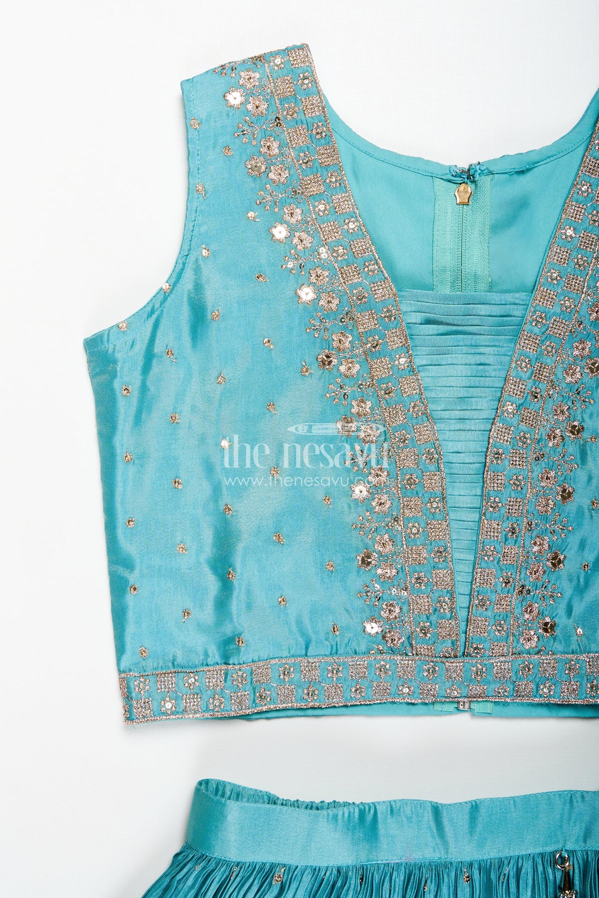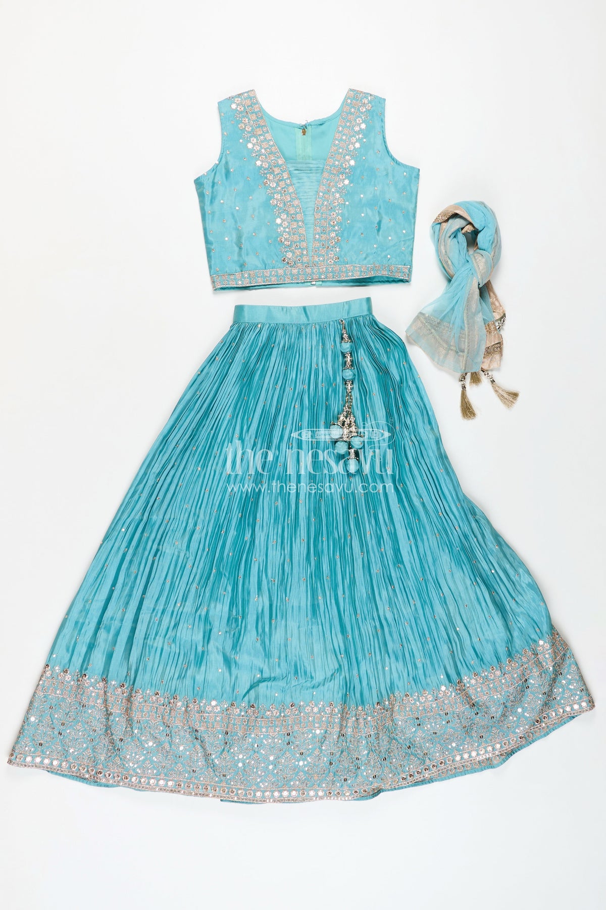 This graceful ethnic plus lehenga for girls is a perfect blend of tradition and elegance, making it an ideal choice for festive occasions and weddings. Crafted from luxurious viscose shimmer chinon silk, the lehenga features delicate pleats and intricate embellishments, creating a regal flow. The sleeveless choli is adorned with exquisite mirror and sequin work, adding a touch of sparkle to the outfit. A beautifully embroidered border enhances the elegance of the lehenga, while the matching dupatta with tassel detailing completes the look. Designed for comfort and style, this ensemble ensures your little one stands out at every celebration.