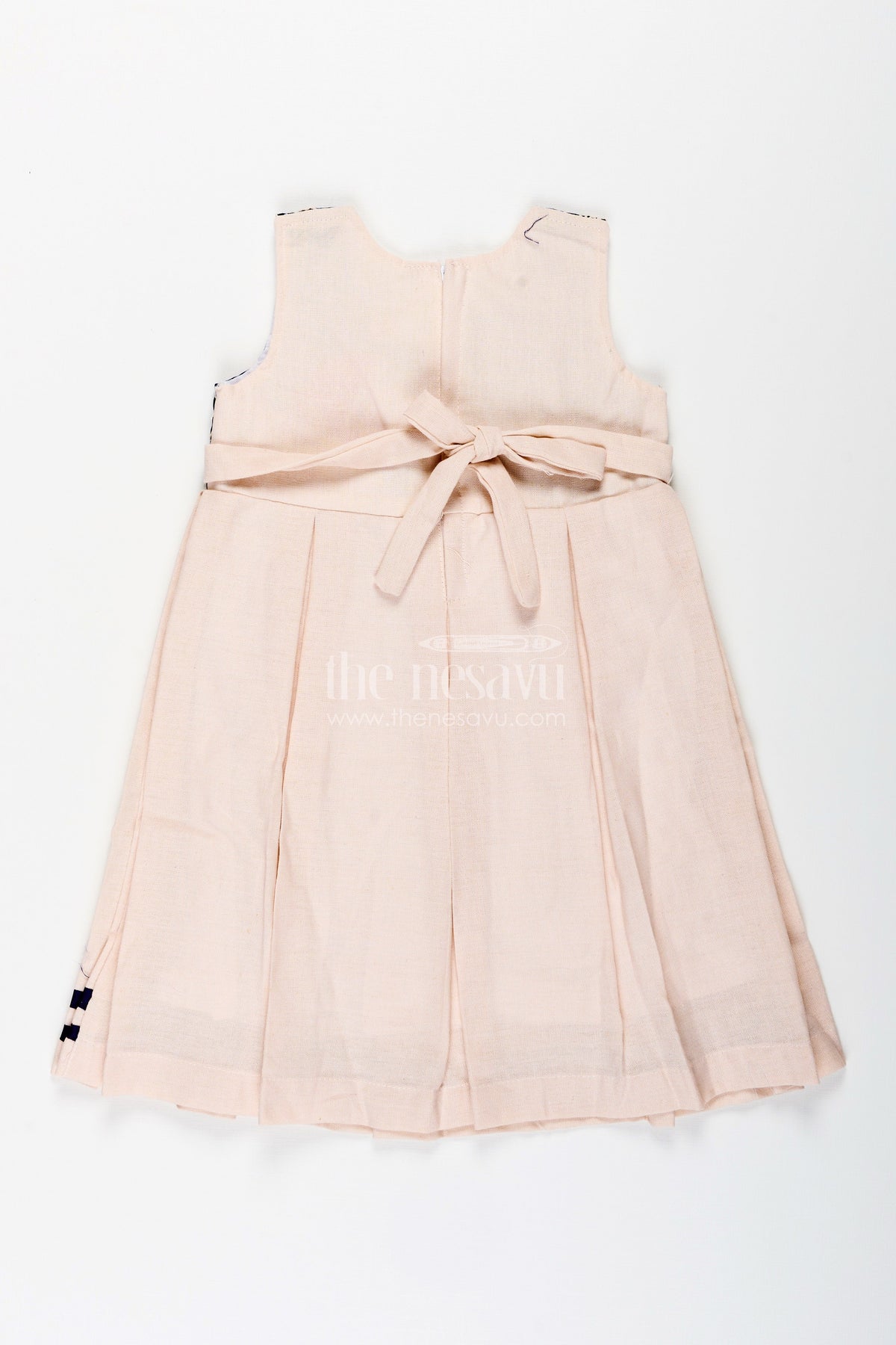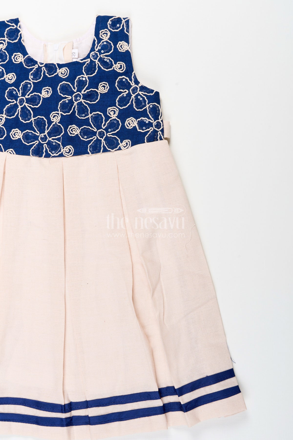 - This baby girl flax cotton frock with navy yoke embroidery is perfect for festive gatherings, birthdays, and family celebrations