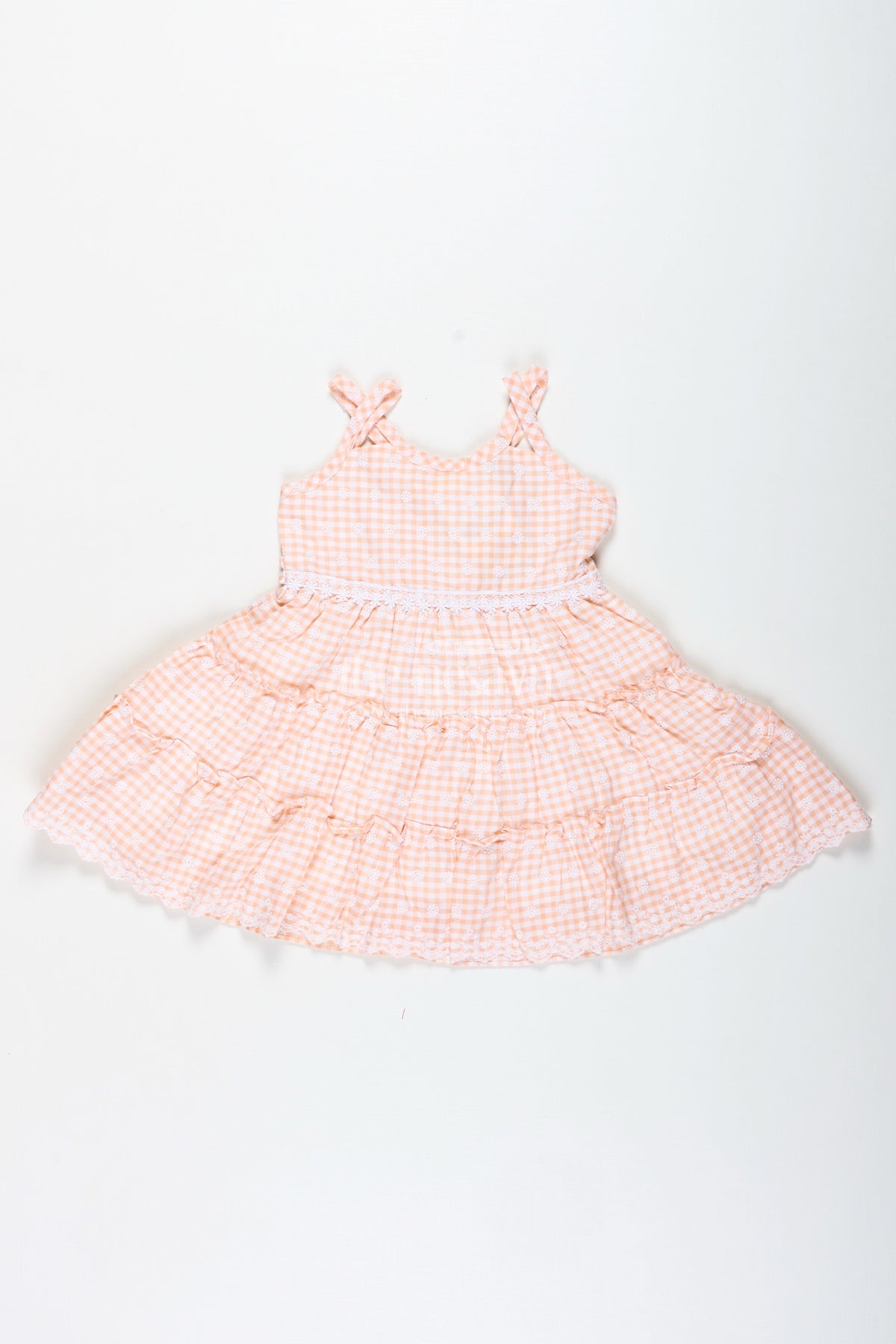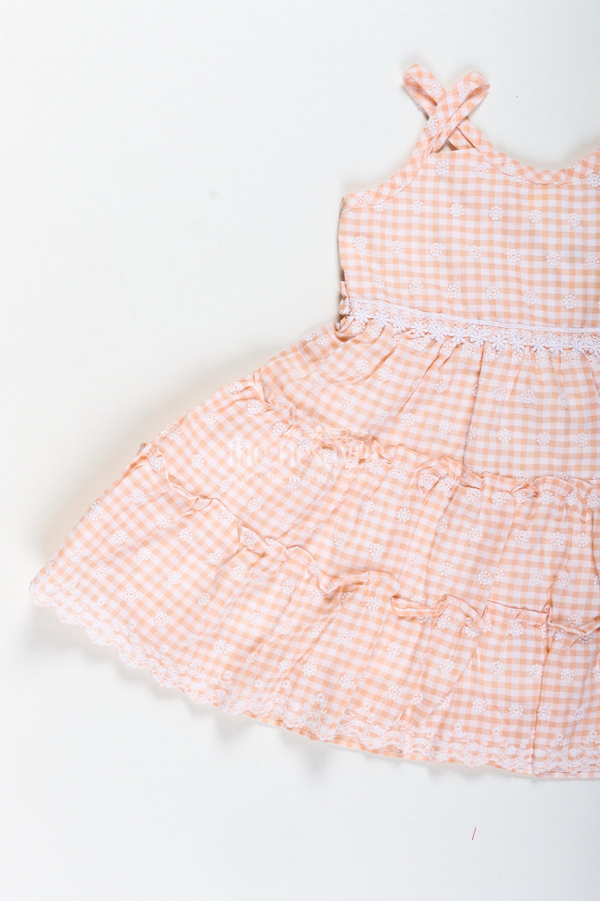Girls Classic Floral Frock combines a timeless silhouette with delicate details, perfect for your little one’s everyday style. Designed in soft cotton with a peach gingham pattern, this frock features intricate thread embroidery that adds an elegant touch. The tiered skirt enhances the volume and swing, while the comfortable shoulder straps and fitted bodice ensure a secure fit. Lightweight and stylish, it’s an ideal choice for both casual and dressy days.