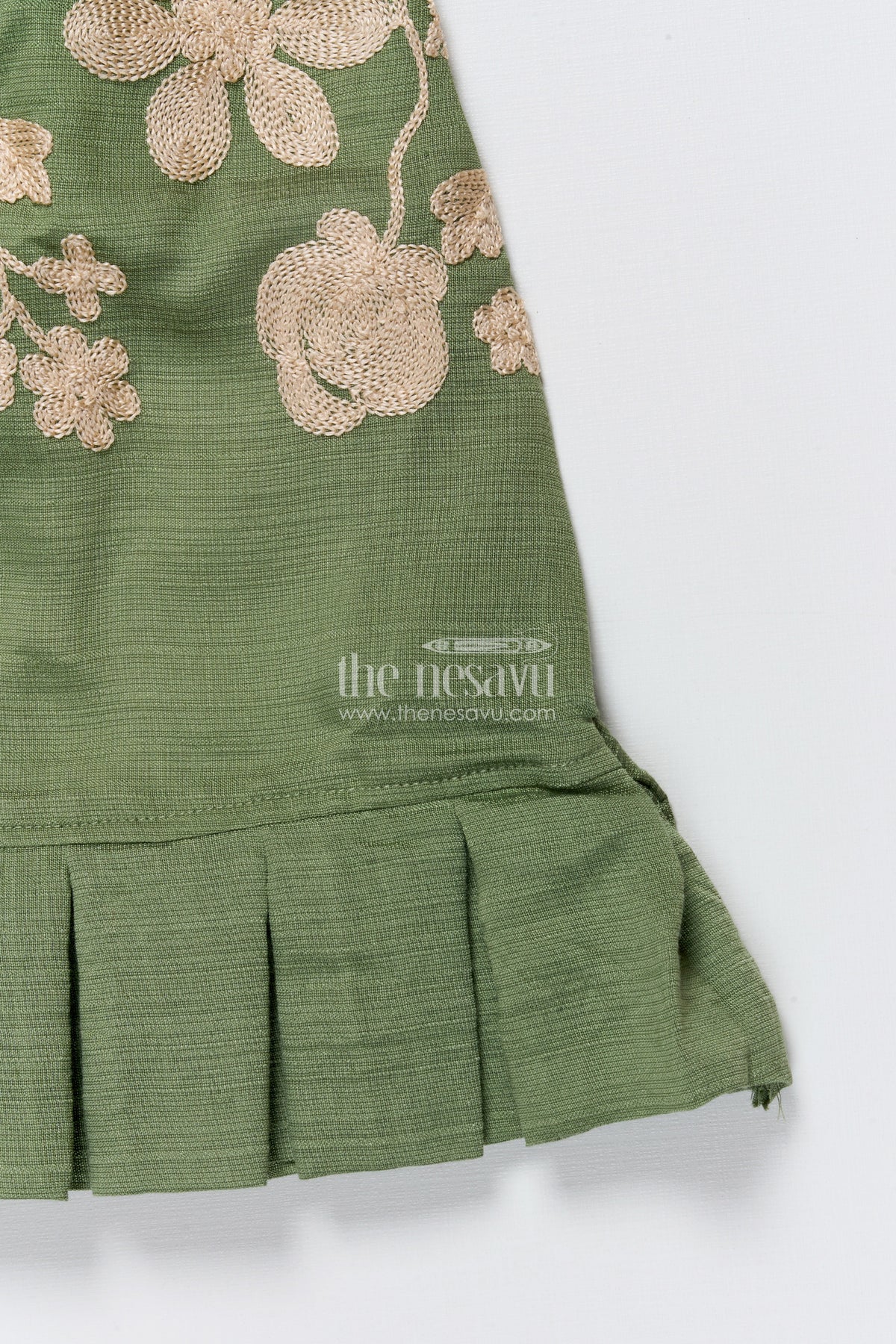 - Design: Thread embroidery, pleated hem
