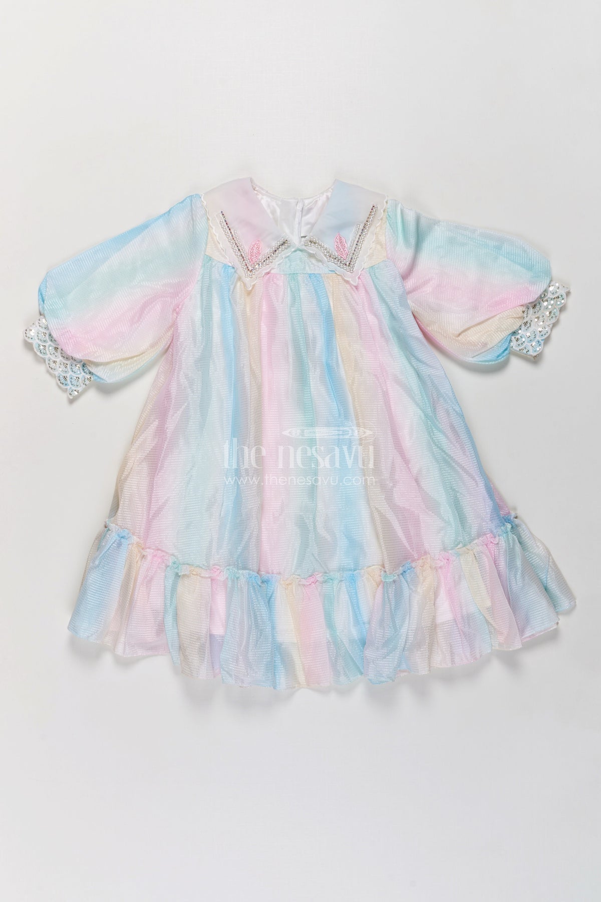 This latest organza long frocks design is a dreamy and delicate piece, perfect for birthdays, parties, or photo shoots. Made from soft organza, this frock showcases a pastel rainbow palette with light-reflective shimmer that captures the eye. It features a flared ruffle hem, lace-trimmed puff sleeves, and an elegant white collar adorned with pearl beading. Lightweight and flowy, it offers a perfect combination of fantasy and comfort - your little one will feel like a princess in this whimsical ensemble.