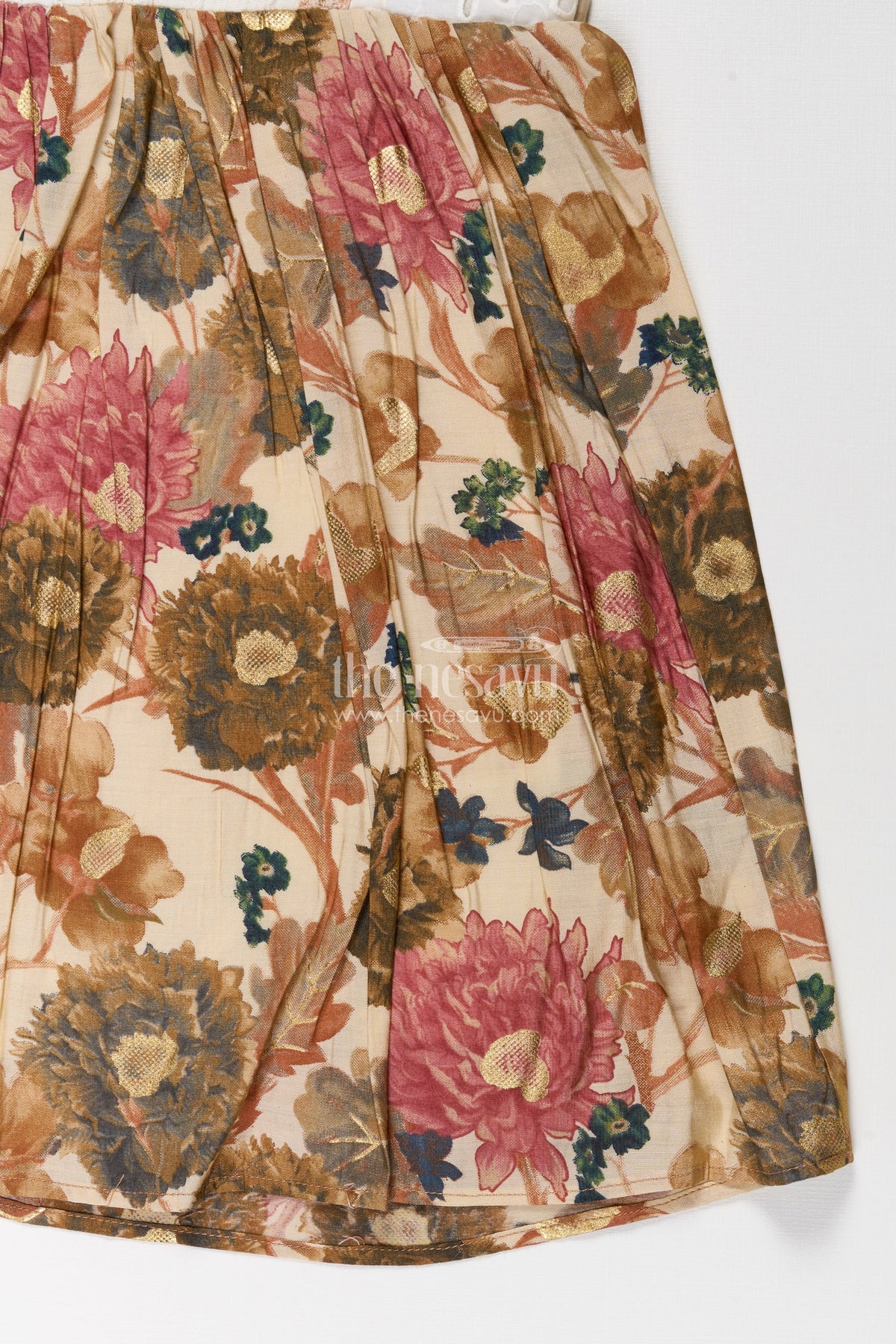 This fancy frock ka design is the perfect blend of comfort and flair for your little one. Made from soft muslin silk, the frock features a finely pleated pintuck yoke with delicate lace accents, leading into a fully flared skirt that showcases a rich floral print in shades of maroon, olive, and beige. The combination of textured and smooth fabrics enhances its visual appeal while keeping the outfit breathable and lightweight. The floral pattern is digitally printed for vibrant clarity and long-lasting charm. Ideal for semi-formal gatherings or stylish everyday wear, this dress adds sophistication without compromising comfort.