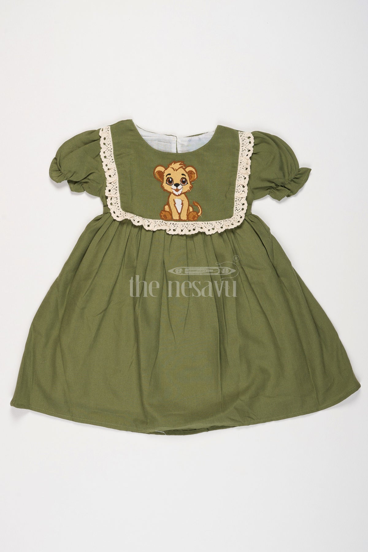 frock front design takes center stage with this smart olive green cotton frock for girls, featuring a beautifully embroidered front yoke. The puff sleeves and empire waistline offer a charming, tailored fit that’s as suitable for daily wear as it is for special occasions. Designed from soft cotton, this frock is breathable and gentle on delicate skin, ensuring day-long comfort. Decorative embroidery and buttons on the front provide extra detail that adds to its stylish appeal. With a subtle flare and modest length, it’s an ideal mix of form and function.