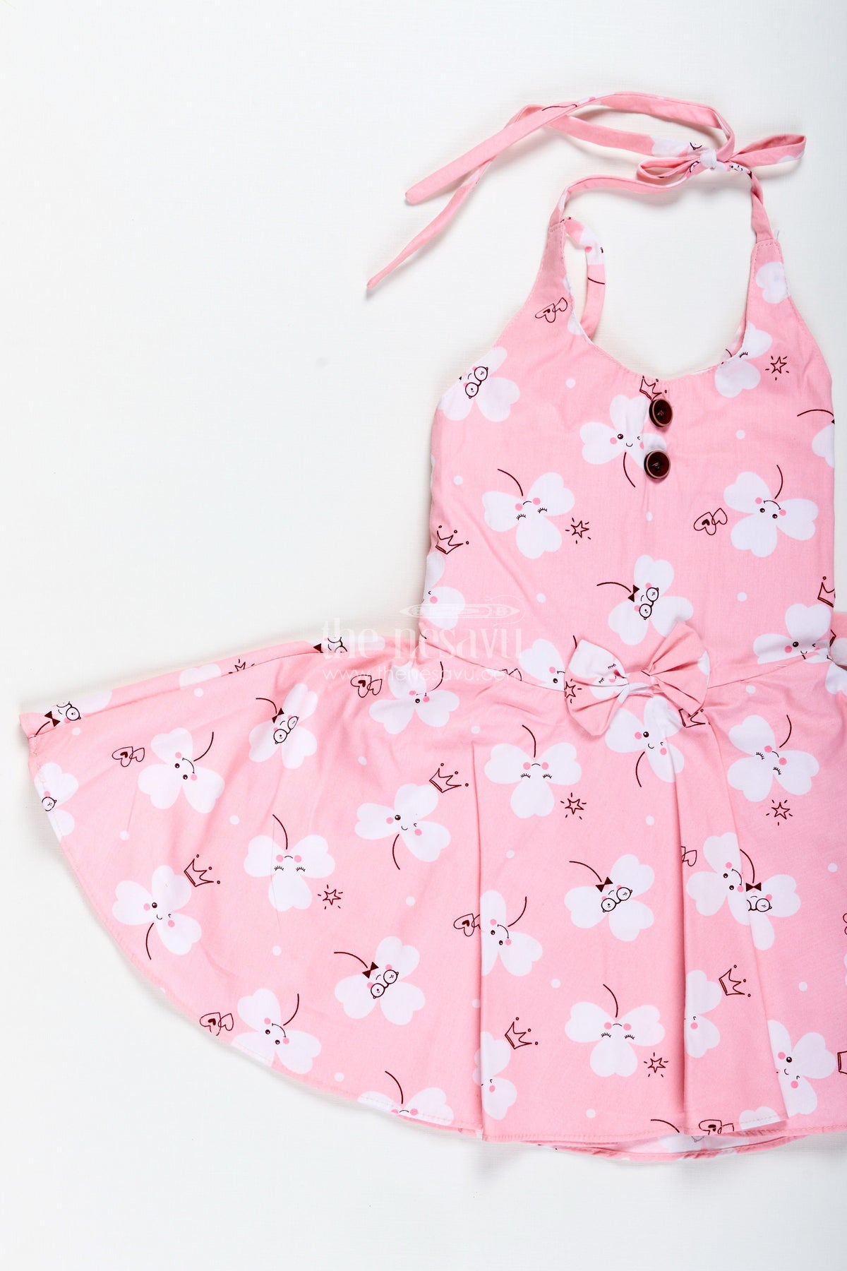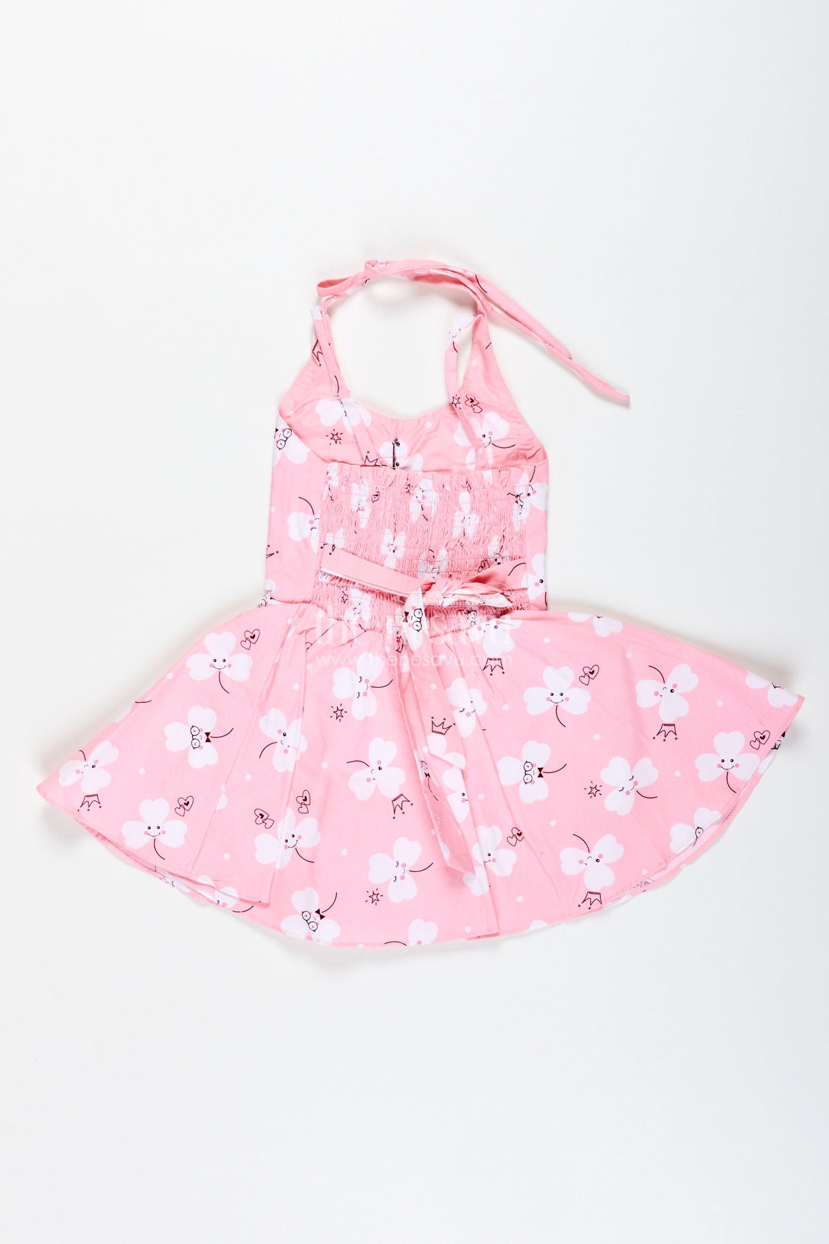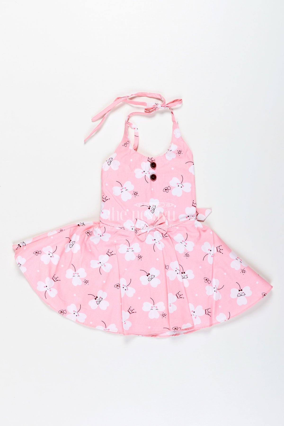 Girls Pink Cartoon Floral Frock with Bow and Pleats for Summer Outings