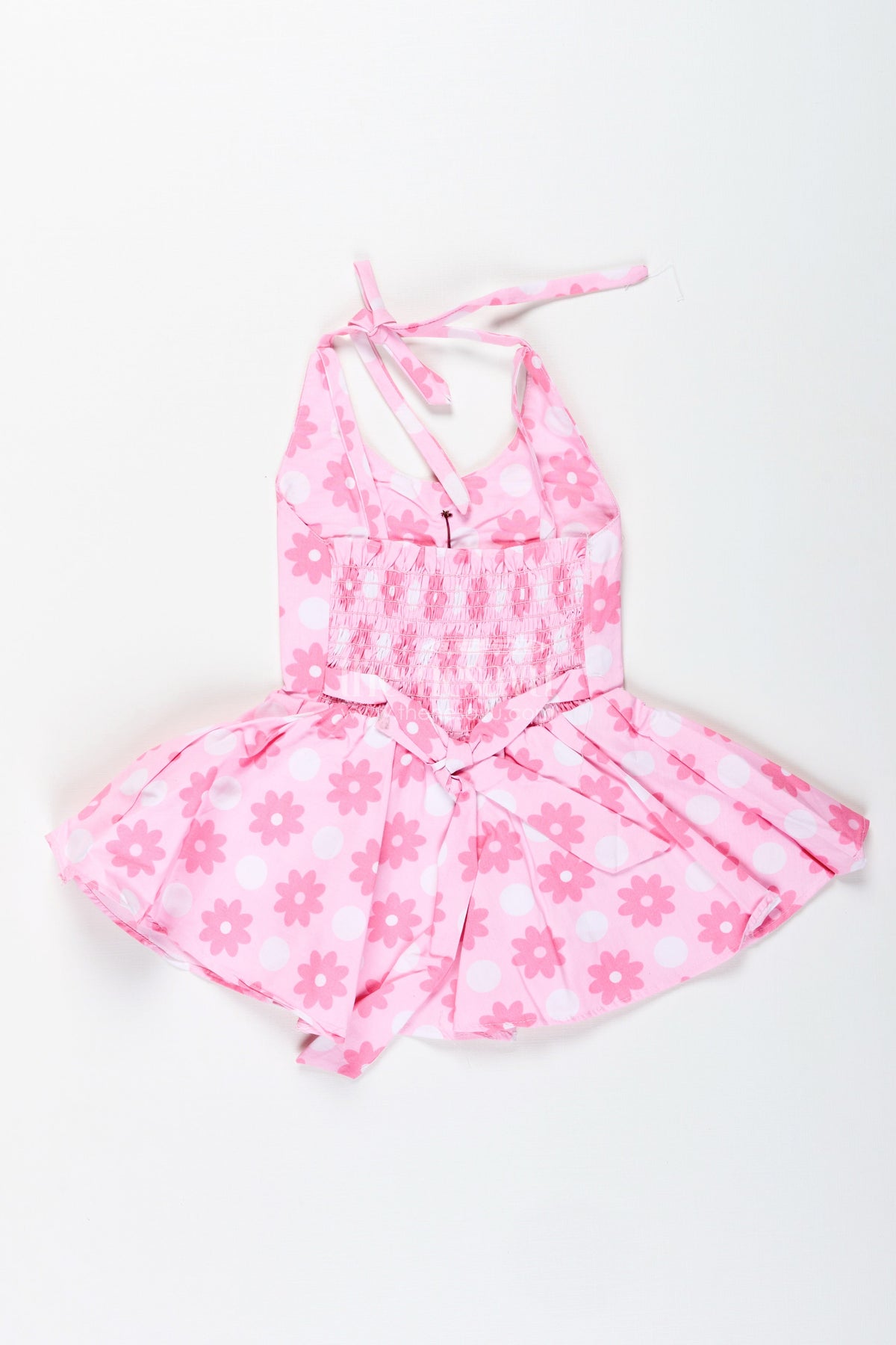 - Design: Polka dot floral print, Pleated skirt, Waist bow