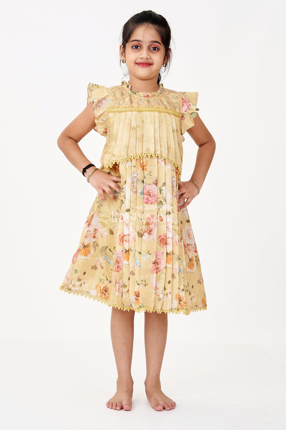 Celebrate the festive charm with this special eid frock featuring a rich yellow cotton blend fabric adorned with vibrant floral prints. The sleeveless silhouette is elevated with a sequin-embroidered yoke that adds sparkle and tradition to the design. Delicate frilled sleeves, pleated panels, and lace trims at the hem bring texture and elegance. This frock is lightweight and breathable, perfect for special occasions like Eid, festive gatherings, or family get-togethers. Pair it with matching sandals for a complete look full of joy and grace.