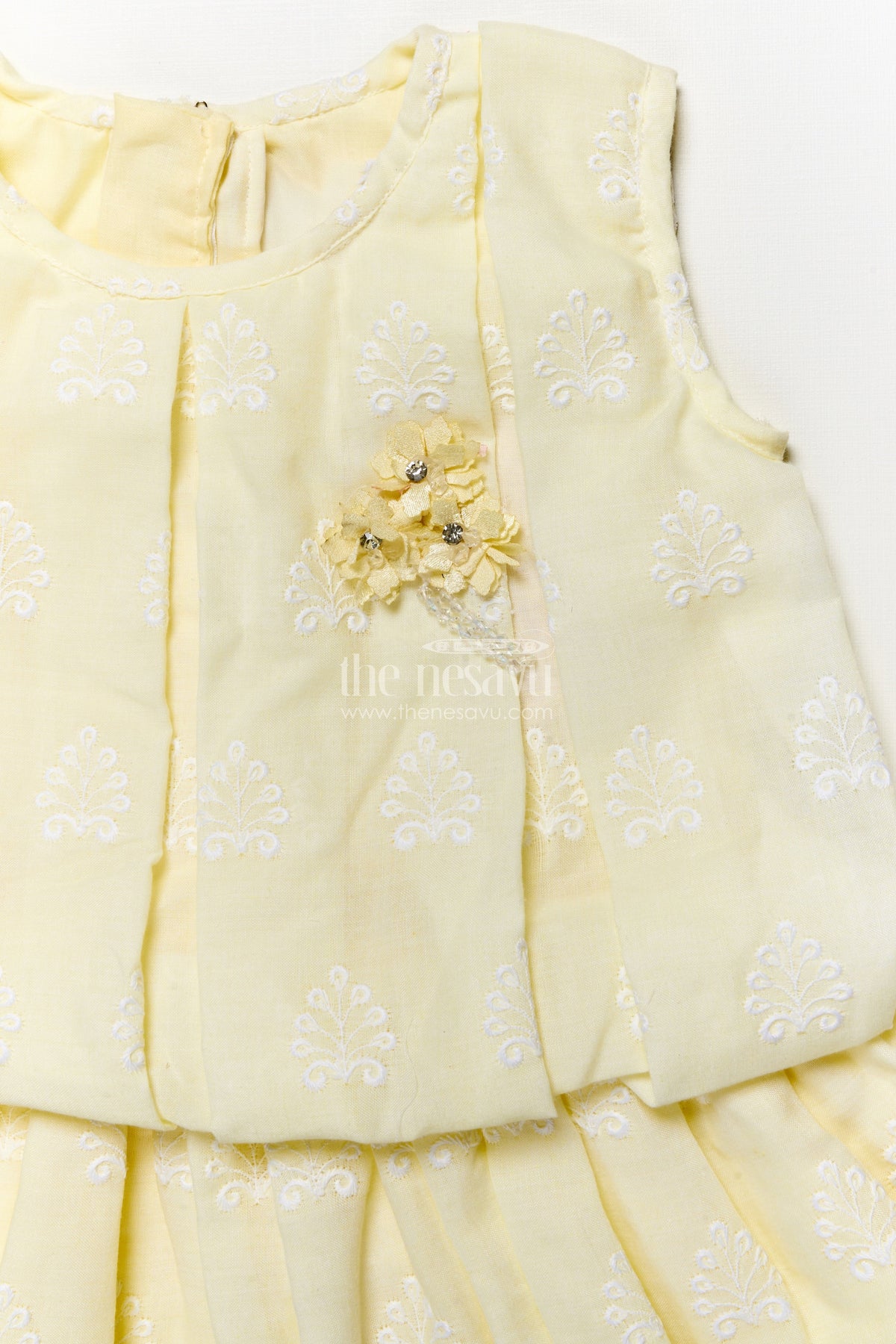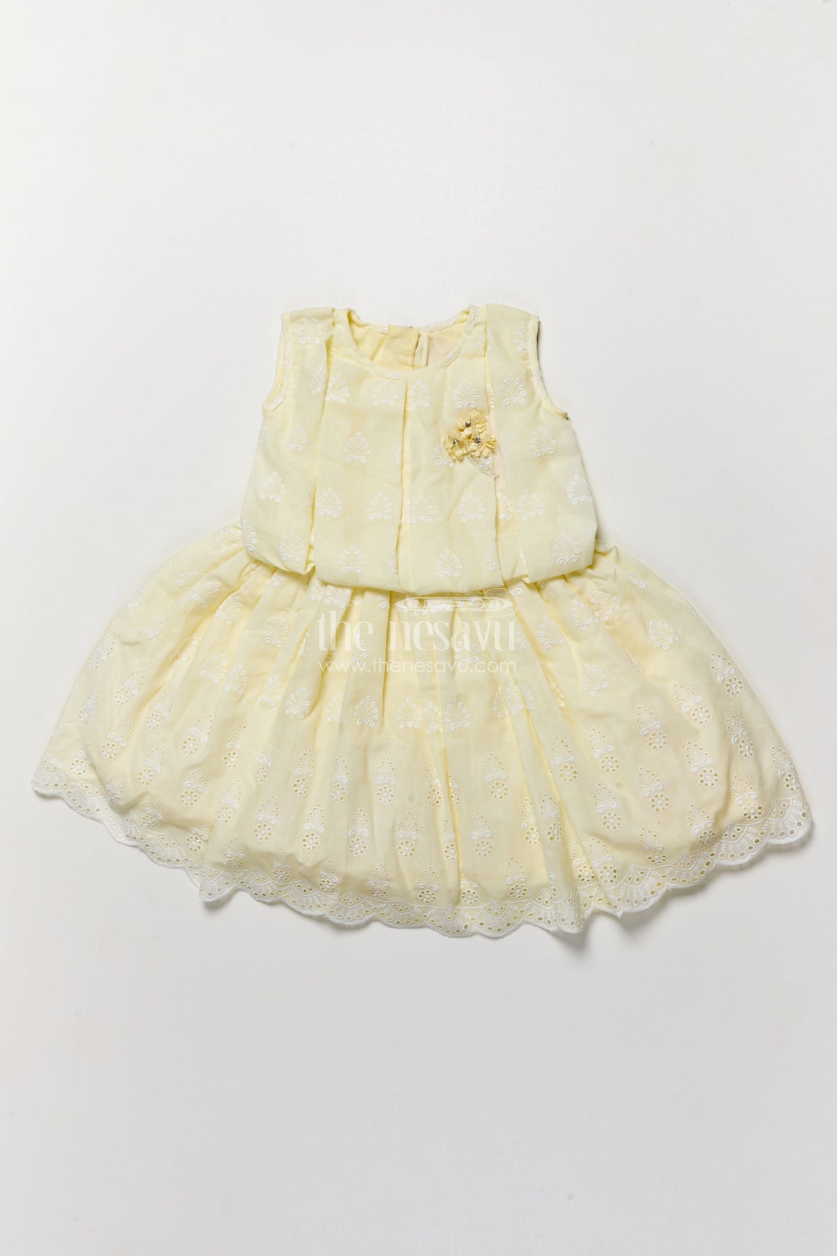 Girls Tulle Frock brings a soft and graceful presence to your little one's wardrobe. Crafted from breathable Hakoba cotton in a delicate pastel yellow shade, this sleeveless frock features embroidered eyelet motifs and a gently pleated bodice. The skirt flares out with scalloped hemline details that add charm and movement. Finished with a sweet floral appliqué on the shoulder, this dress is perfect for birthday parties, photo shoots, or family events. Lightweight and comfortable, it pairs classic embroidery with a modern silhouette, making it both playful and refined for young girls.