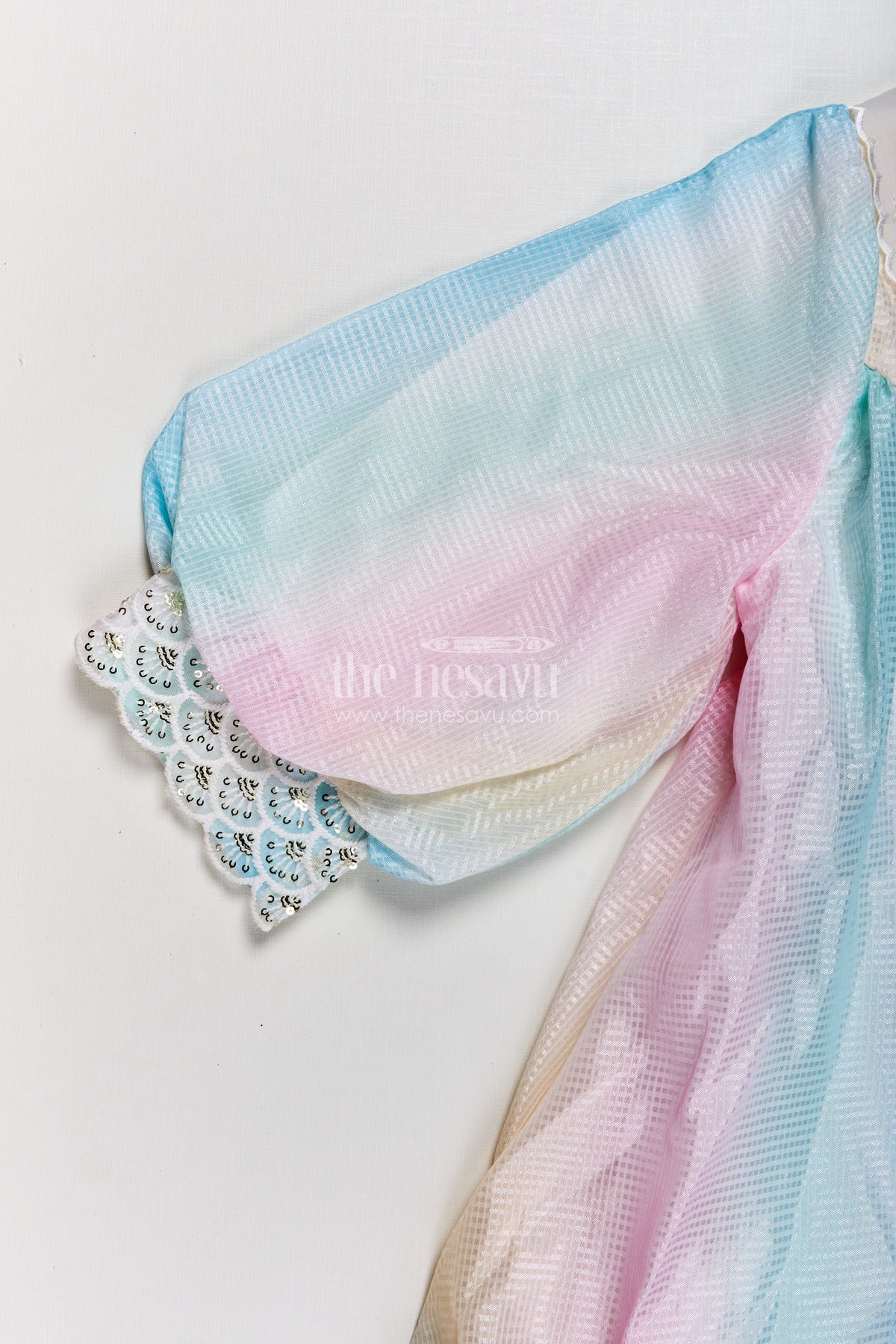 The Nesavu Girls Fancy Frock Multi Colour Frock Design for Girls in Pastel Organza with Frills and Decorative Collar Nesavu Multi Colour Frock Design Girls Organza Puff Sleeves Decorative Lace Collar | The Nesavu