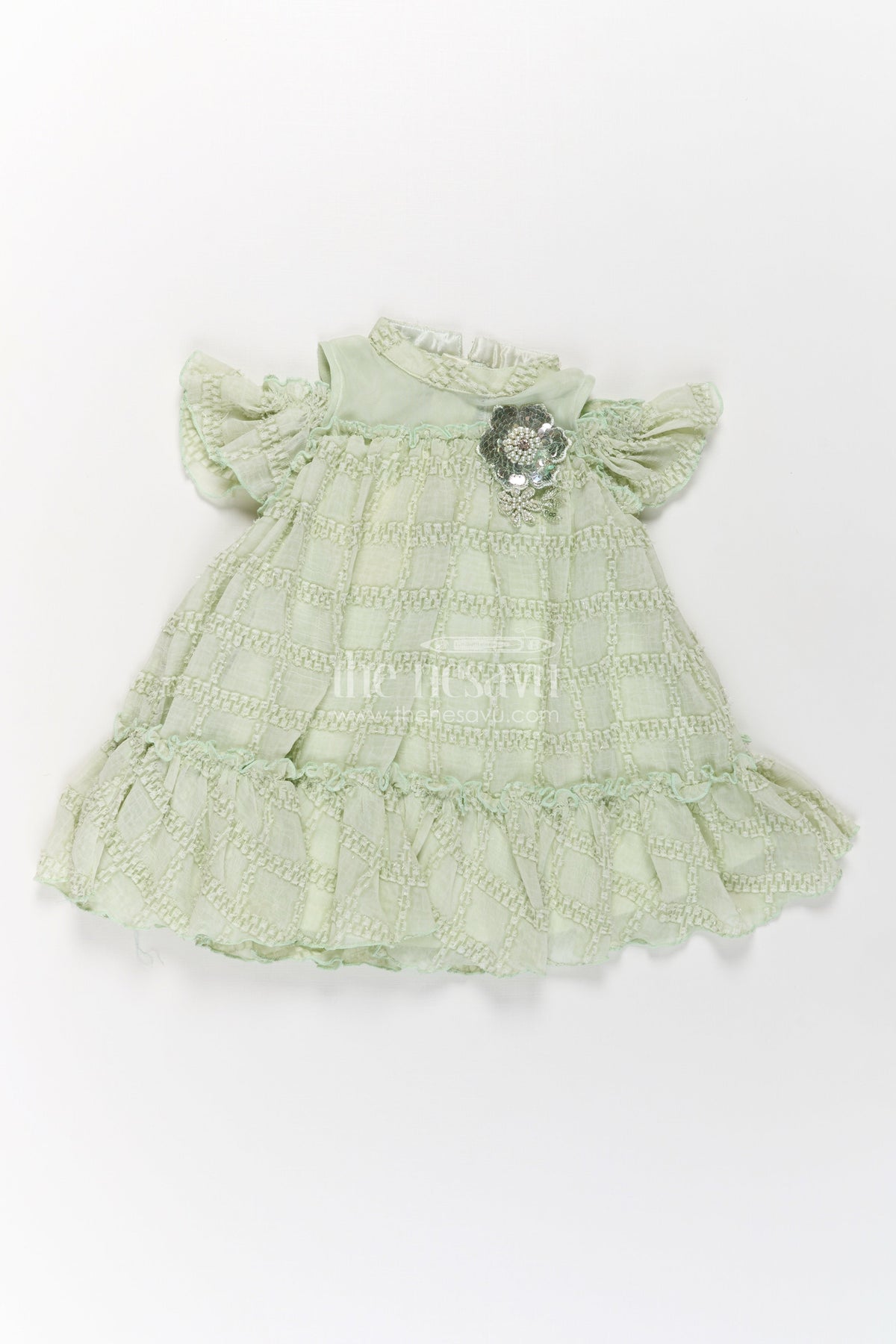 Organza dress frock from Nesavu adds a refreshing and delicate look to your girl's wardrobe. Crafted in soft light green organza, this frock features textured grid-style weaving with layered ruffles along the hem and sleeves. A sparkling floral brooch adds a playful accent to the chest, elevating the outfit’s charm. Lightweight and breezy, this dress is perfect for summer parties, family functions, and photo shoots. The back zipper ensures easy wear while the breathable organza keeps your little one comfy and camera-ready.