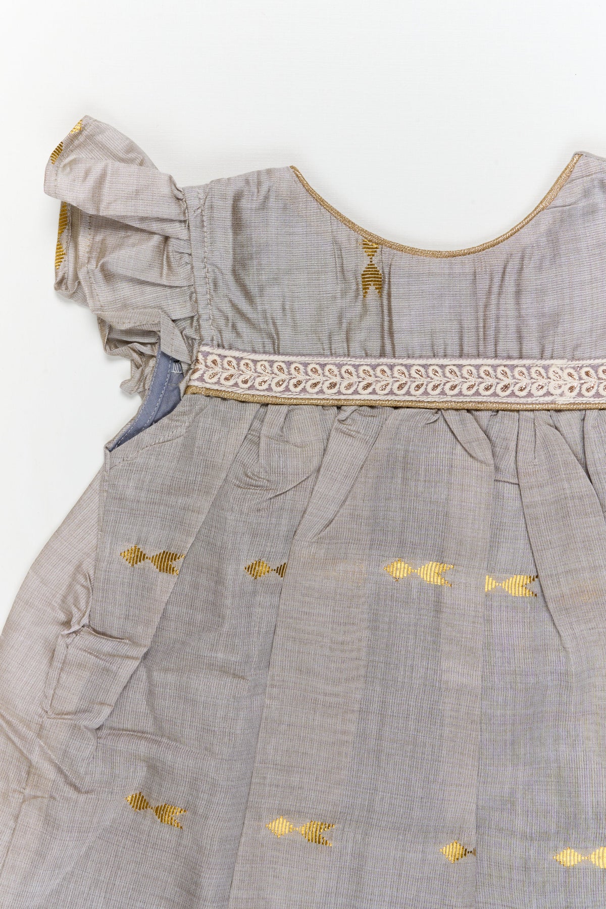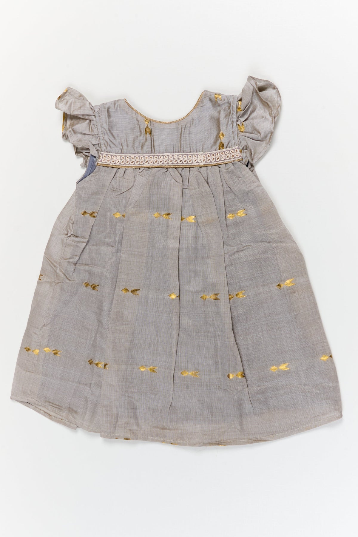 - This toddler girl frock is tailored from viscose silk with golden butti accents