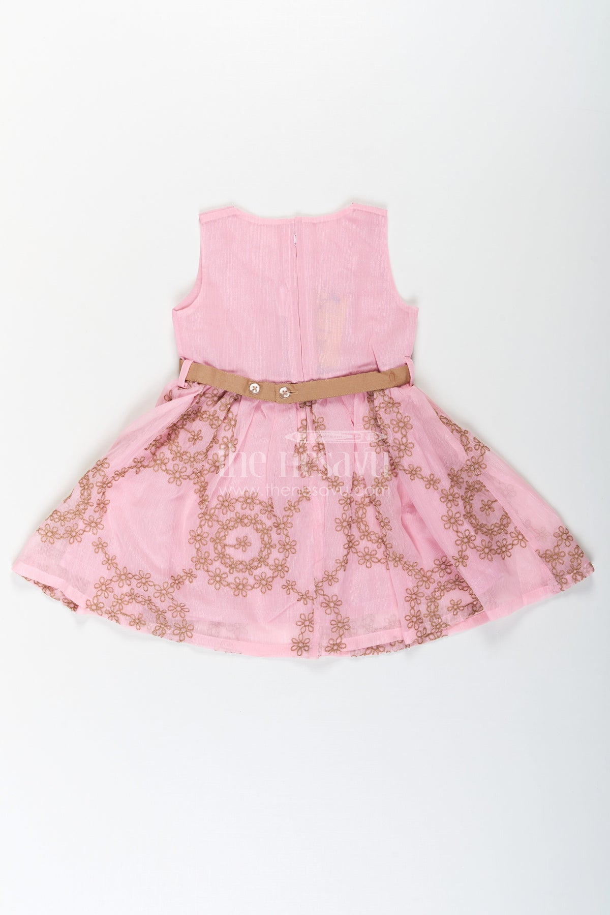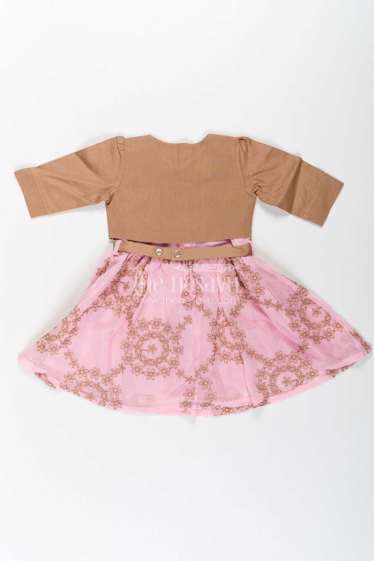 Work frock meets stylish sophistication in this Nesavu cotton blend dress featuring a sleeveless pink frock and a contrast brown embroidered overlay jacket. The frock includes an elegant waistband bow and embroidered mesh overlay for a subtle glam look. The lightweight, breathable fabric ensures all-day comfort, while the detachable jacket makes it a versatile pick for both casual and semi-formal outings. Perfect for family events or day gatherings, this frock balances charm and wearability.