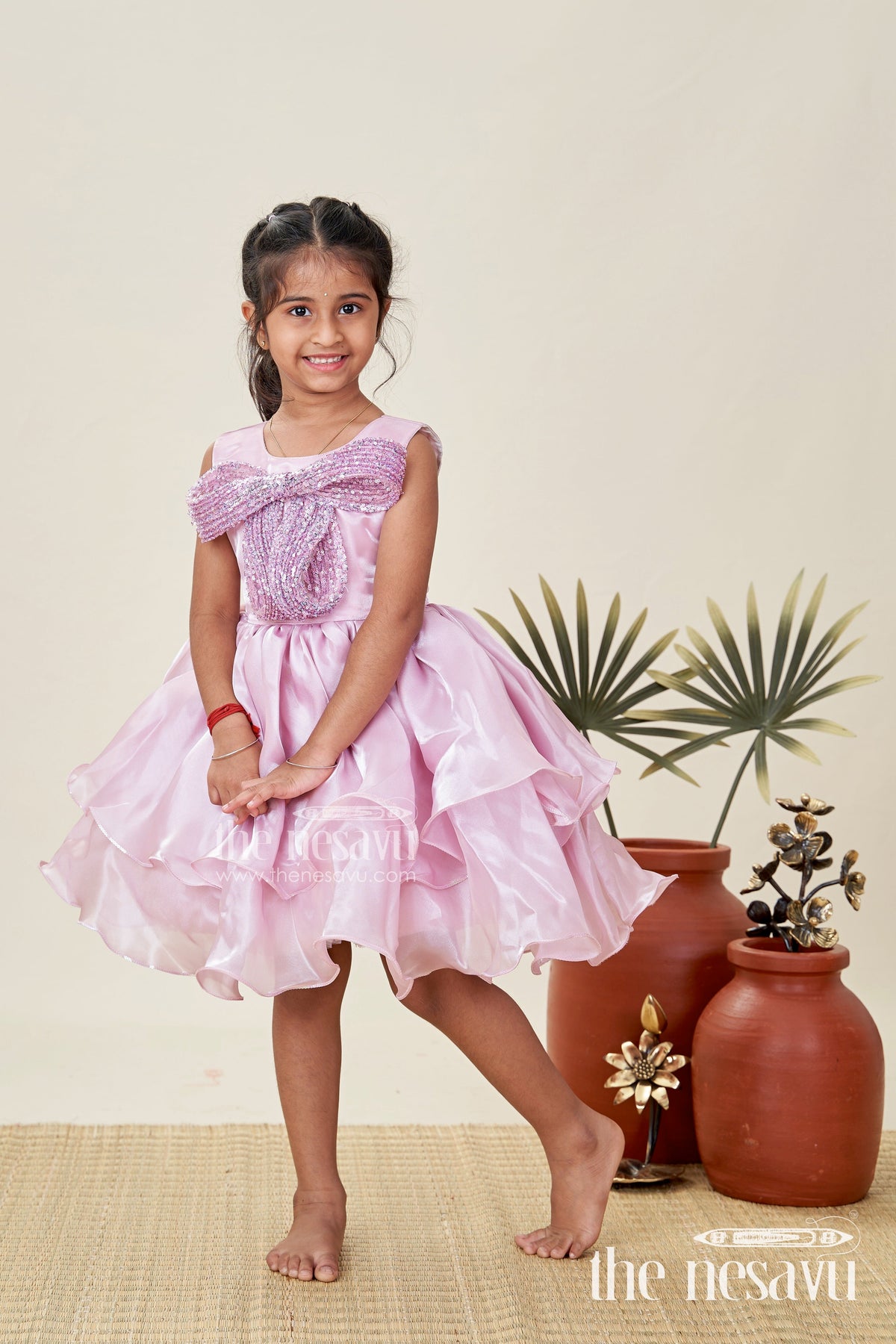 Birthday Party Frock for Girls is a glamorous showstopper designed to make every birthday extra special. Crafted from glossy organza in a soft pink hue, the dress features cascading layered ruffles that create beautiful movement and volume. At the bodice, a dazzling oversized beaded bow adds a glamorous focal point that elevates the overall look. Lightweight and eye-catching, this frock is perfect for birthdays, celebrations, or festive evenings. The soft material ensures comfort while the dramatic design promises a memorable impression, making it a must-have party outfit for stylish little girls.