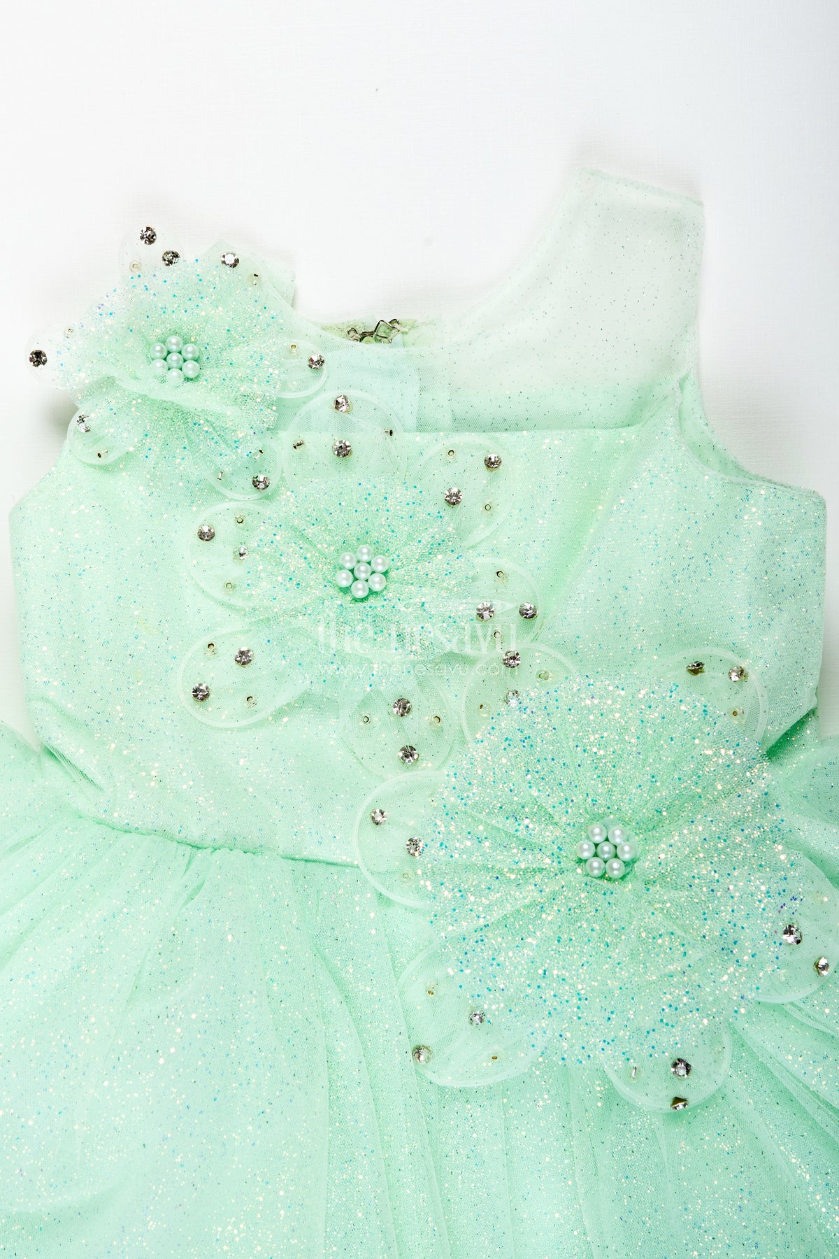 Girls Fancy Birthday Frock is a charming light green dress designed to make birthdays extra memorable. Crafted in soft shimmer fabric, the frock features a layered tulle skirt that sparkles with every twirl. The bodice is adorned with 3D floral appliqué embellished with pearls and rhinestones, adding a delightful touch of elegance. The sleeveless cut offers comfort and ease of movement, perfect for active play during parties. A secure back zip makes dressing up quick and fuss-free. This enchanting frock captures the magic of childhood celebrations, making it an ideal pick for photoshoots, birthday parties, and other cheerful events. Let your little one glow in this fairy-like ensemble that blends sparkle, comfort, and style effortlessly.