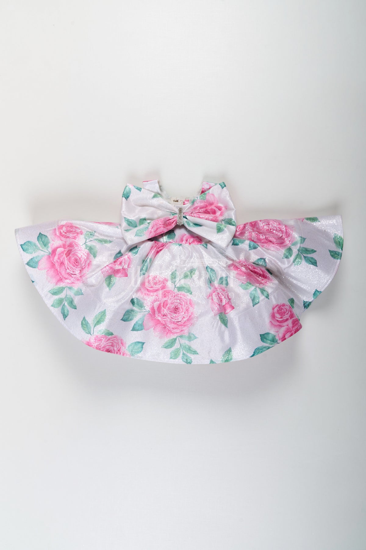 This trendy frocks piece is a dazzling choice for little fashionistas who adore sparkle and florals. Made from satin glitter fabric, it features a soft white base covered in vibrant pink floral digital prints, highlighted with a large, structured bow at the front. The flared silhouette creates a fairy-tale charm that twirls effortlessly, while the glitter finish adds a magical shimmer. Perfect for birthday parties, special photoshoots, or family gatherings, this frock guarantees compliments and endless smiles.