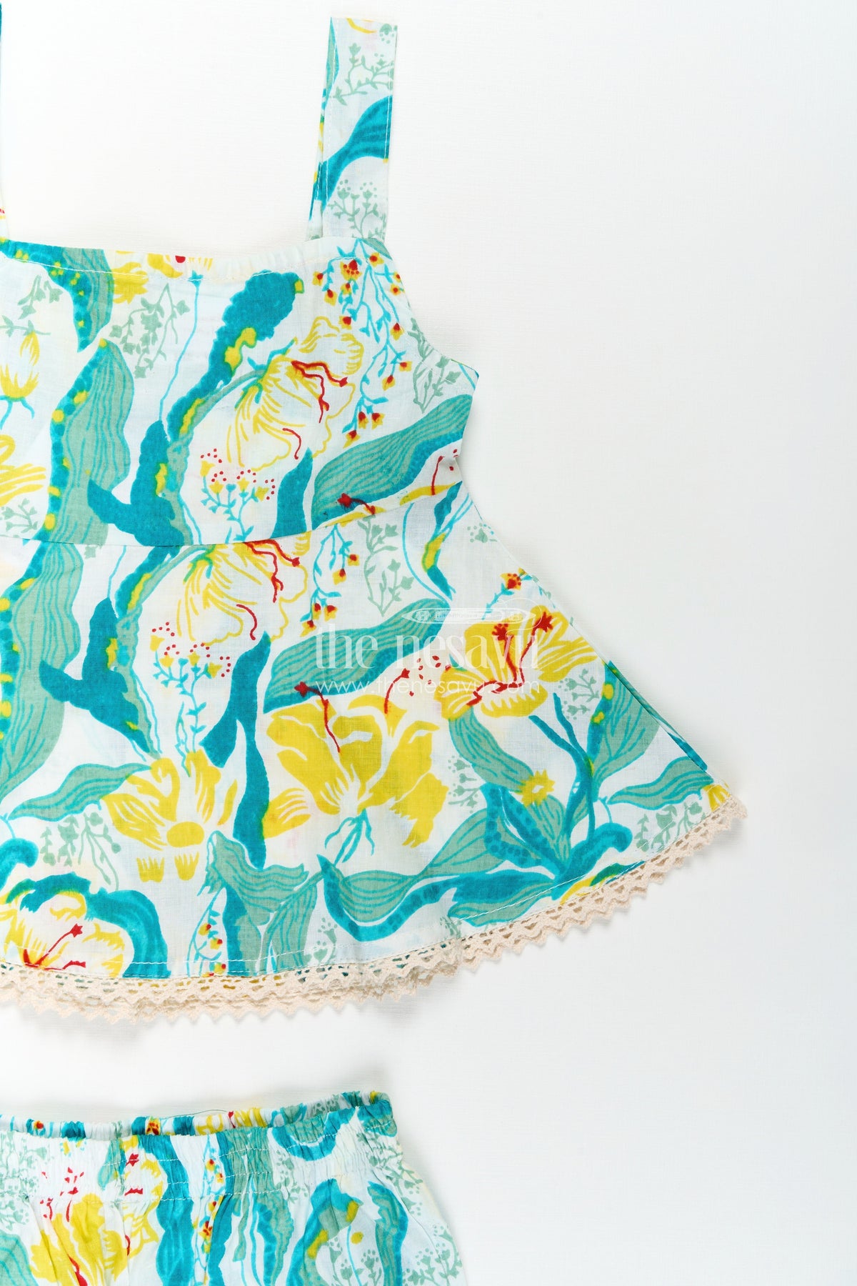 Dress girls in soft elegance with this charming cotton casual set featuring a sleeveless flared top and comfy elastic pants. The light cream base is brought to life with a fresh floral digital print in green and yellow hues, inspired by nature’s breezy palette. The top features a lace-trimmed hem that adds a playful twist, while the relaxed-fit pants make it ideal for all-day movement and comfort. Crafted from breathable cotton, this set ensures your child stays cool and stylish during warm days. Whether it’s a day at the park or a cozy family gathering, this outfit pairs practicality with a flair for fun perfect for dressing up little girls with effortless charm.