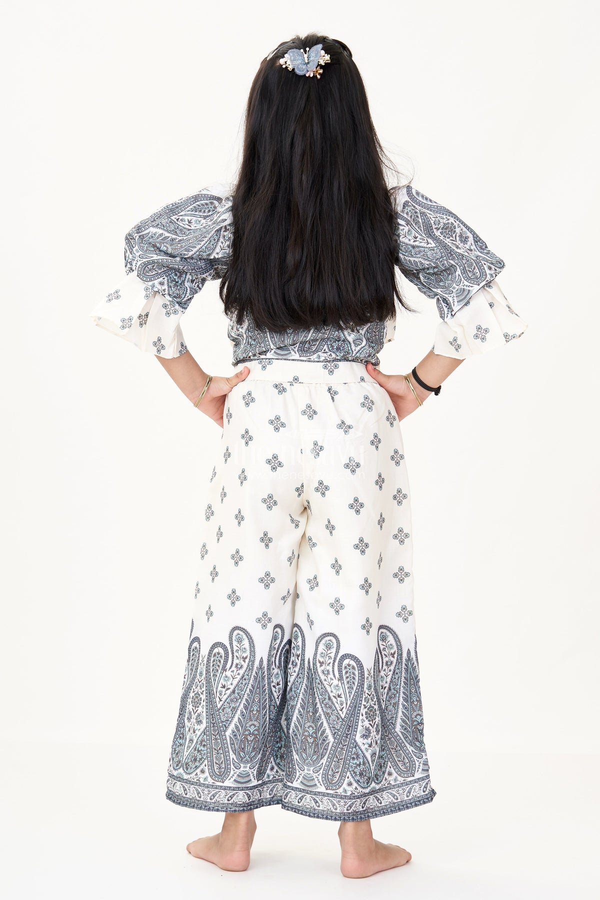 The peach casual set is a unique addition to any girl's ethnic wardrobe. Made from breathable cotton blend fabric, this outfit features a light peach tone with green paisley and floral prints that add depth and elegance. The puffed sleeves, collared cropped top, and matching casual pants create a bold and modern silhouette while staying rooted in tradition. This set is perfect for festive events, school functions, or stylish everyday wear.