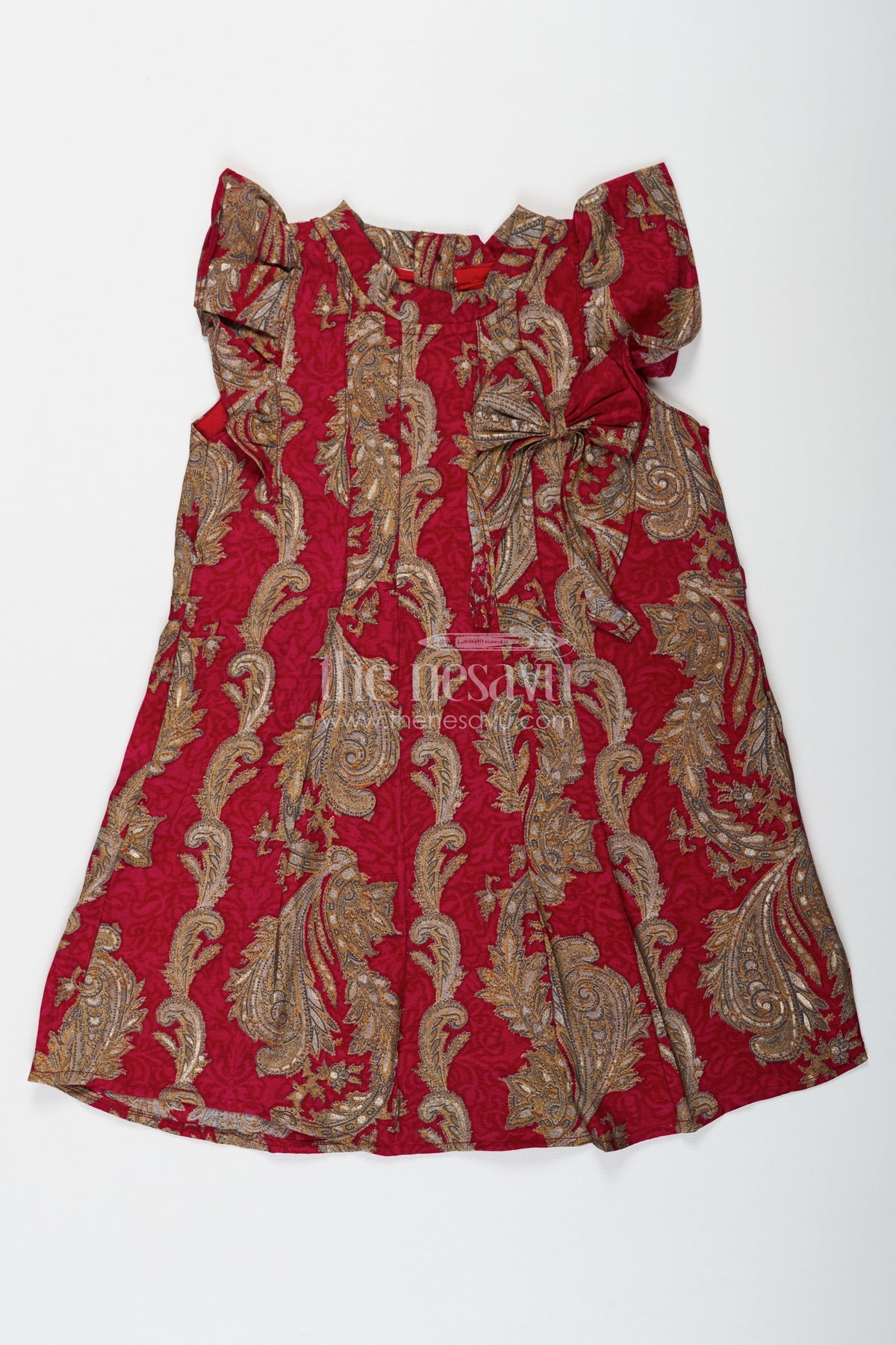 Dress party wear becomes extraordinary with this radiant Girls Red Chanderi Frock, embellished with rich gold Baroque designs that bring festive elegance to every twirl. Crafted from premium Chanderi fabric, this dress features a vibrant red backdrop intricately woven with shimmering golden patterns, creating a regal appeal. The soft, breathable texture ensures a comfortable fit for your little one’s spirited activities. The chic bow on the bodice adds a playful yet sophisticated touch, while the neatly structured pleats enhance its graceful silhouette. Designed to offer both style and practicality, this frock is lightweight, easy to move in, and perfect for festive celebrations, family functions, or stylish day-outs. Give your child a taste of classic elegance blended with modern ease with this standout piece.