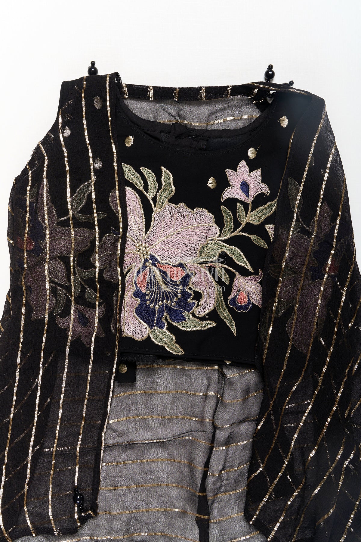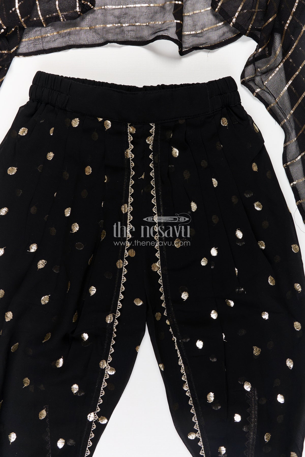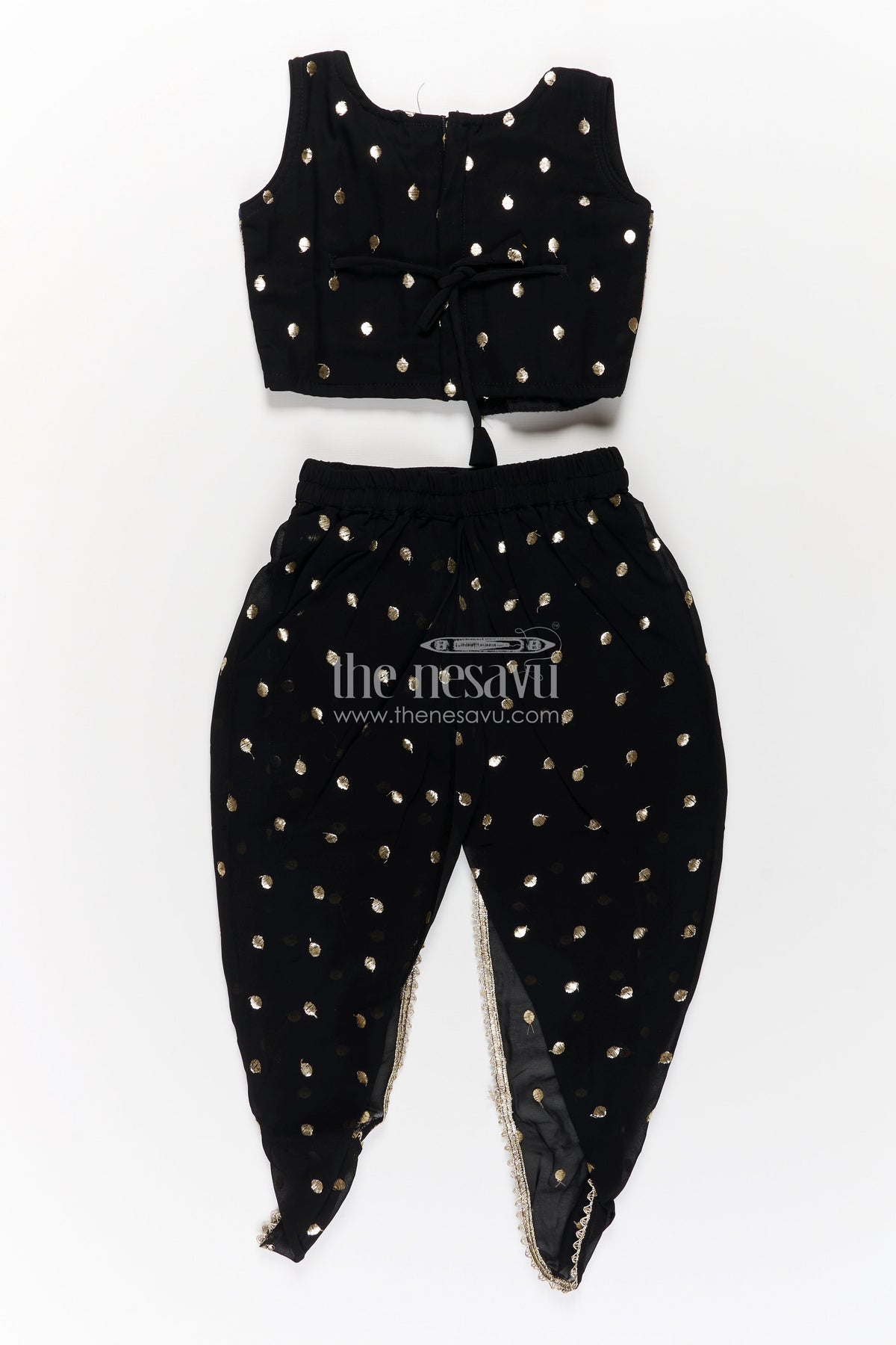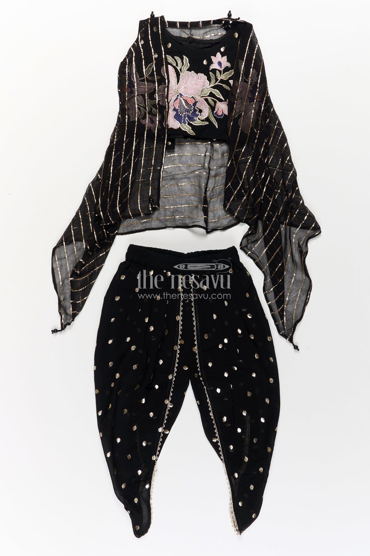 The dhoti plazo design is a stylish fusion of ethnic and contemporary wear, designed for girls who love to stand out. This set includes a black embroidered crop top with intricate thread work, matched with relaxed dhoti-style pants and a stripe-printed overlayer for contrast. The ensemble is elevated with a mirror-accented dupatta, bringing sparkle and charm. Lightweight and breezy, the georgette fabric ensures comfort throughout the day. Ideal for weddings, dance events, or festive gatherings, it offers movement-friendly elegance with bold detailing.