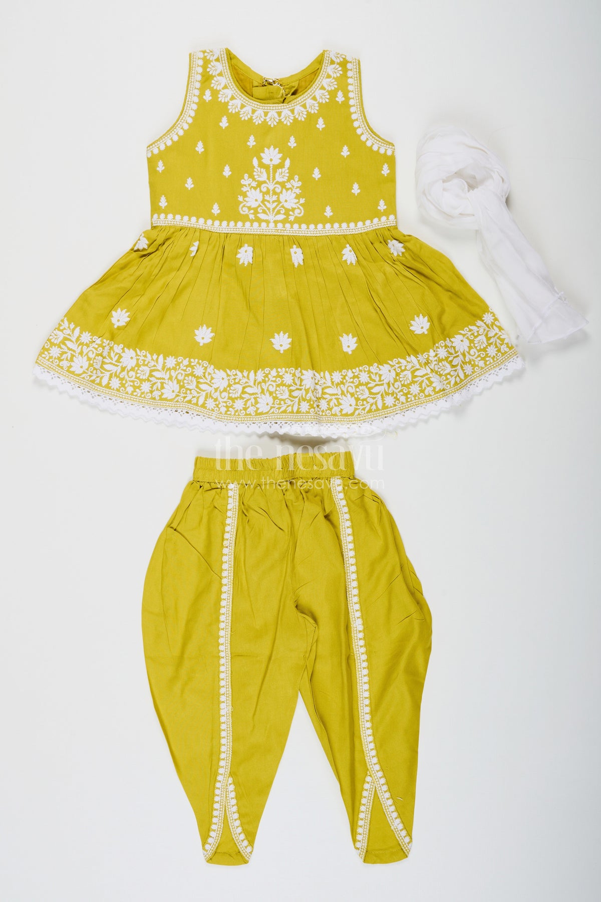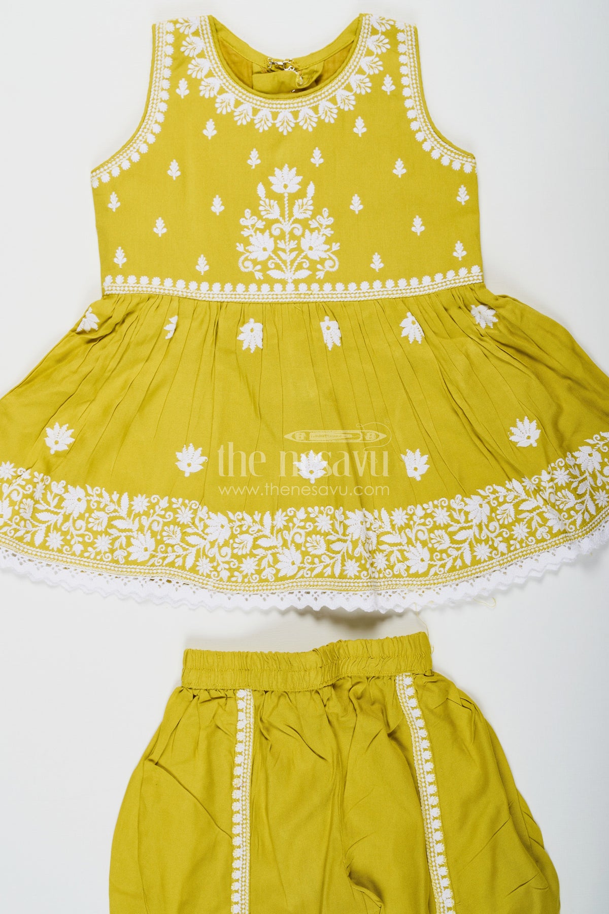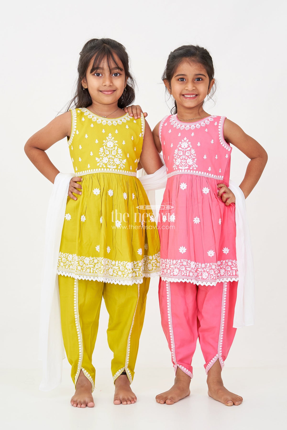 This vibrant green color sharara set is a gorgeous ethnic option for girls who love standing out during celebrations. Crafted from soft rayon, the kurti features elegant white thread embroidery in floral motifs, complemented by a flowy matching sharara bottom detailed with embroidered taping. The ensemble is completed with a white dupatta for a traditional finish. Ideal for weddings, pujas, and festive gatherings, this outfit blends ethnic charm with comfort.
