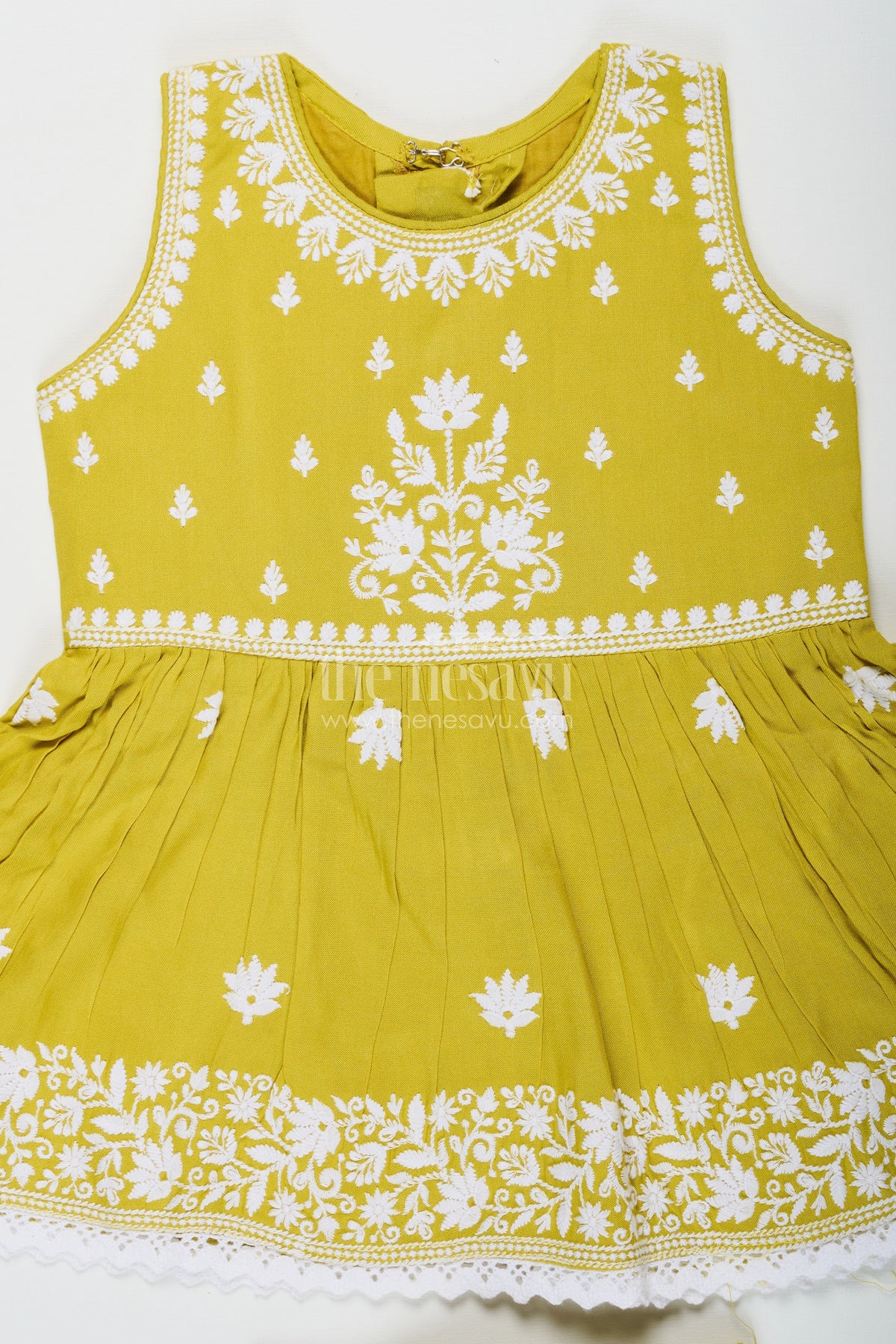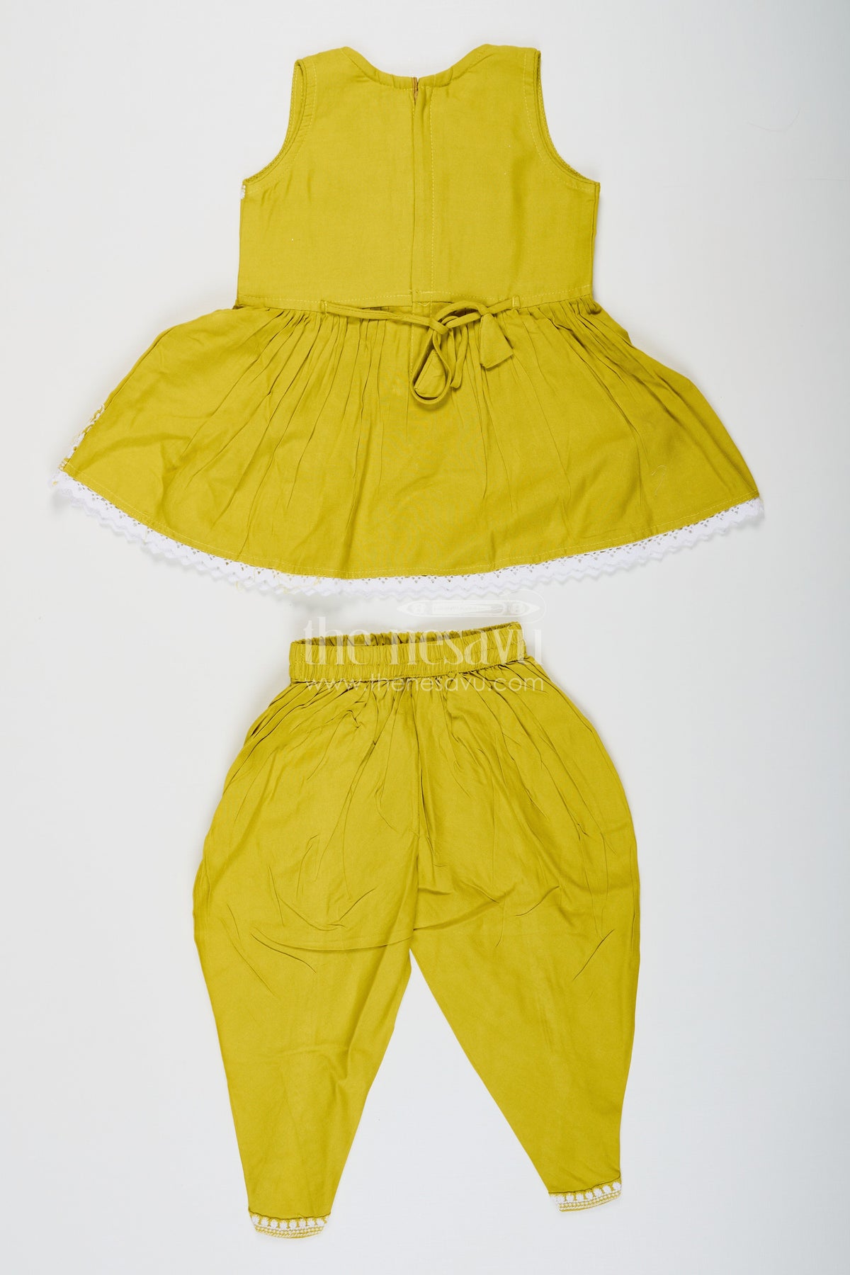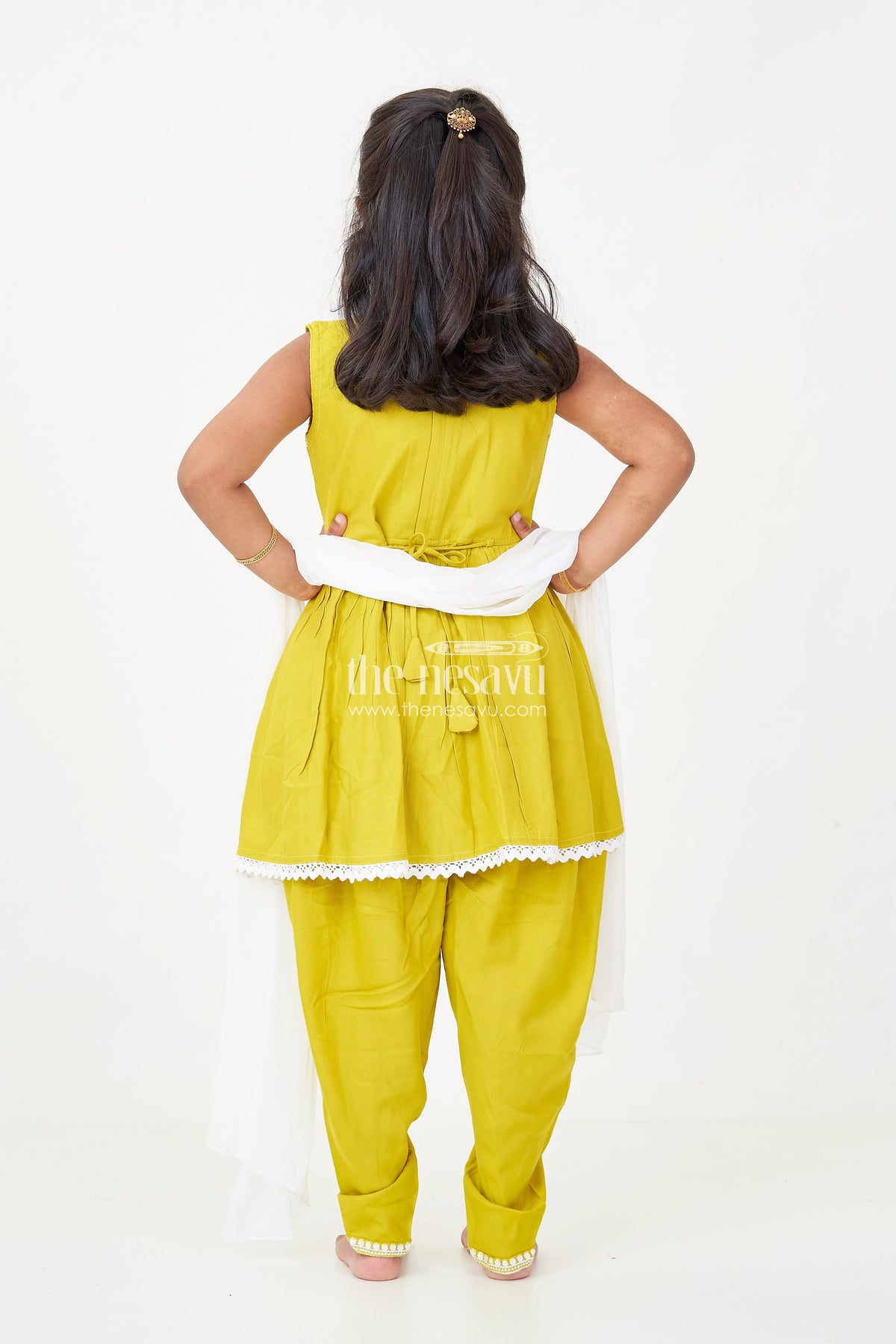This vibrant green color sharara set is a gorgeous ethnic option for girls who love standing out during celebrations. Crafted from soft rayon, the kurti features elegant white thread embroidery in floral motifs, complemented by a flowy matching sharara bottom detailed with embroidered taping. The ensemble is completed with a white dupatta for a traditional finish. Ideal for weddings, pujas, and festive gatherings, this outfit blends ethnic charm with comfort.
