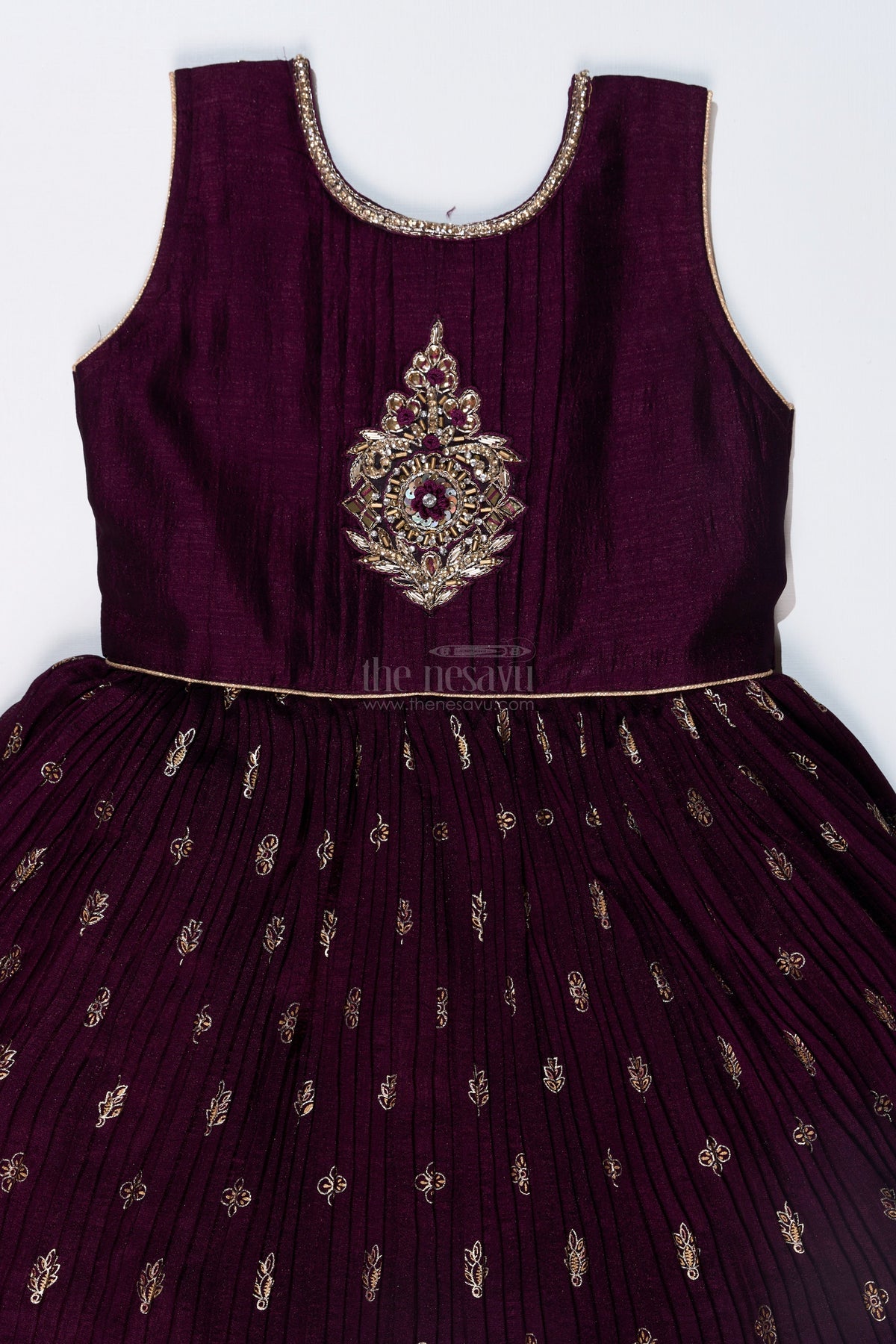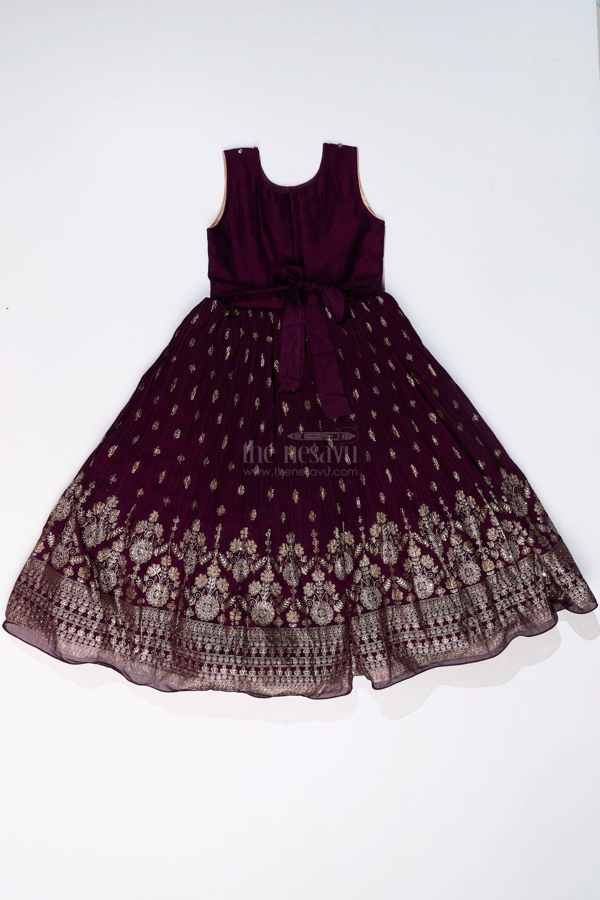 The Nesavu Girls Silk Gown Elegant Girls Wedding Wear Gown in Rich Blend Silk with Foil Prints and Intricate Embroidery Nesavu Girls Wedding Wear Gown Blend Silk Foil Prints Embellished Yoke | The Nesavu