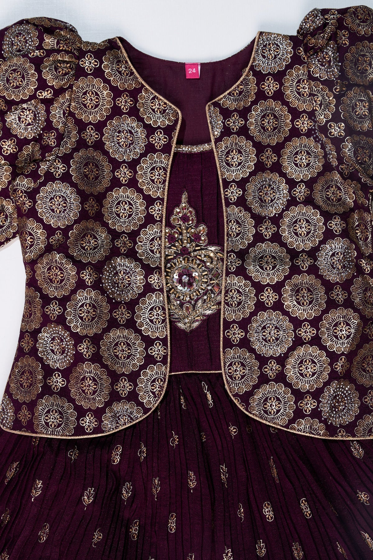 This exquisite wedding wear gown is a stunning choice for grand celebrations. Designed in a luxurious blend silk fabric with intricate foil prints, this gown is crafted to give your little girl a regal look. The rich, deep hue is enhanced by detailed golden embroidery, adding a touch of elegance and charm. Featuring a sleeveless bodice with an embellished yoke, the pleated skirt flows gracefully, making it ideal for weddings and festive occasions. The set includes a matching embroidered dupatta, completing the traditional yet contemporary appeal. Comfortable yet stylish, this gown ensures ease of movement while maintaining its graceful silhouette. Perfect for making a statement at weddings, receptions, and cultural gatherings, this ensemble is a must-have for your little fashionista.