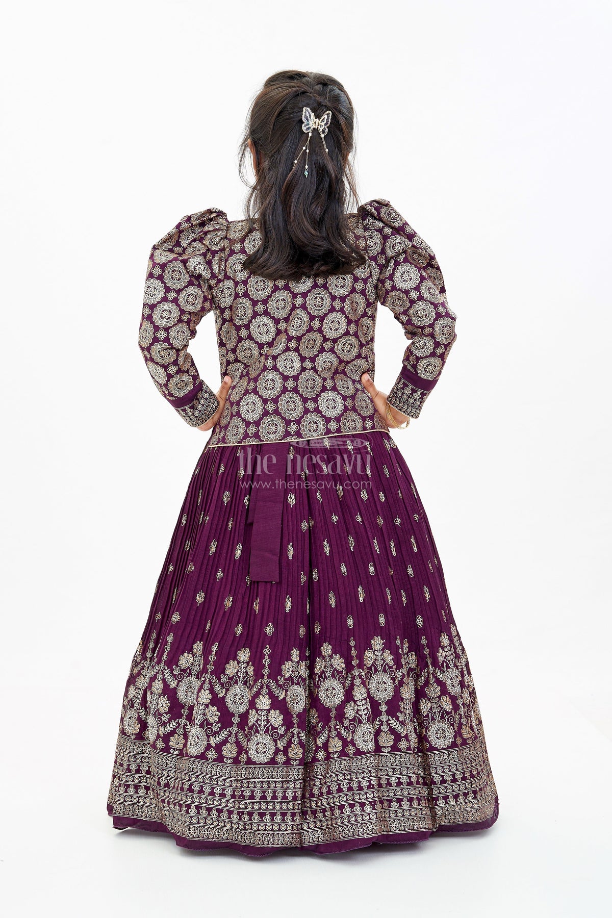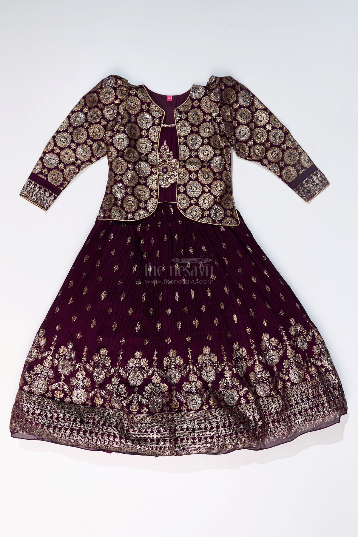 The Nesavu Girls Silk Gown Elegant Girls Wedding Wear Gown in Rich Blend Silk with Foil Prints and Intricate Embroidery Nesavu 24 (5Y) / Purple GA297B-24 Girls Wedding Wear Gown Blend Silk Foil Prints Embellished Yoke | The Nesavu