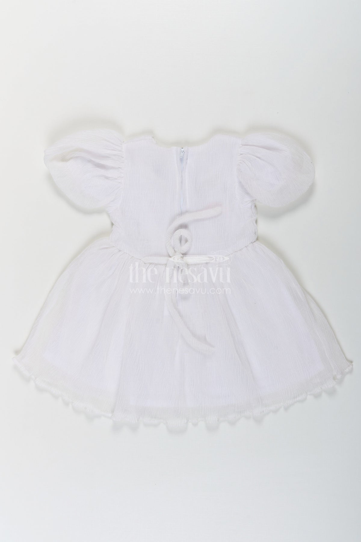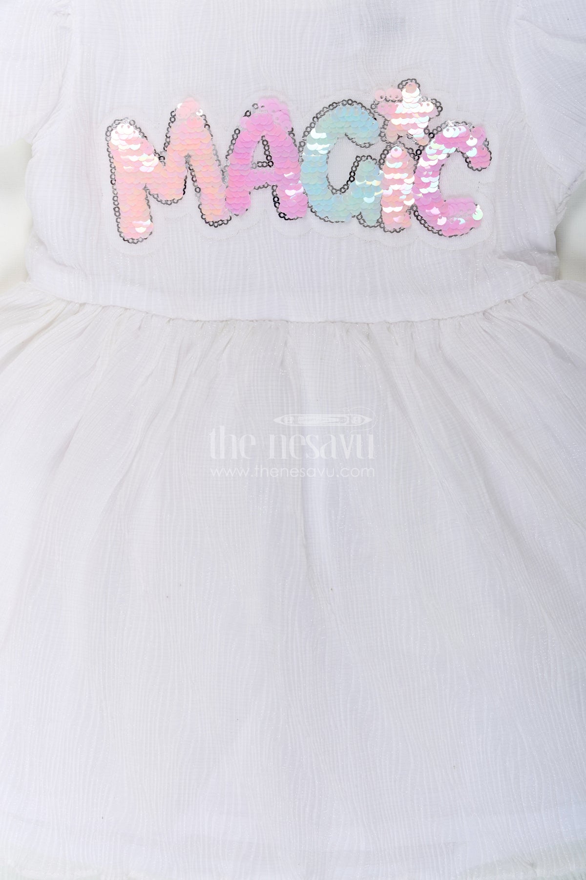 This chun wala frock in pure white Chinon chiffon is a dreamy outfit for your little girl. The airy silhouette, puffy sleeves, and pastel multicolor “MAGIC” sequin embroidery make it a showstopper. Its soft texture and flowy cut ensure comfort all day long. Whether it’s a party or a casual occasion, this frock brings effortless charm and plenty of twirl-worthy fun.