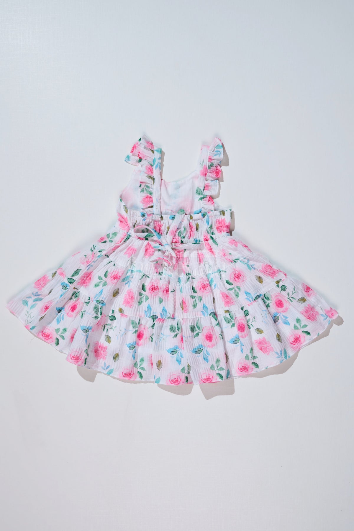 Celebrate in style with this frock for birthday party, designed to make your little princess shine. Crafted from blended silk popcorn fabric, this dress features a soft and flowy texture, ensuring maximum comfort. The charming pink floral print gives a fresh and elegant look, while the tiered ruffle design creates a beautiful, twirl-worthy silhouette. A satin bow embellishment adds the perfect finishing touch, making it an ideal outfit for birthdays, festive events, and special occasions. Style it with cute ballerina shoes and a matching hair accessory for a picture-perfect look.