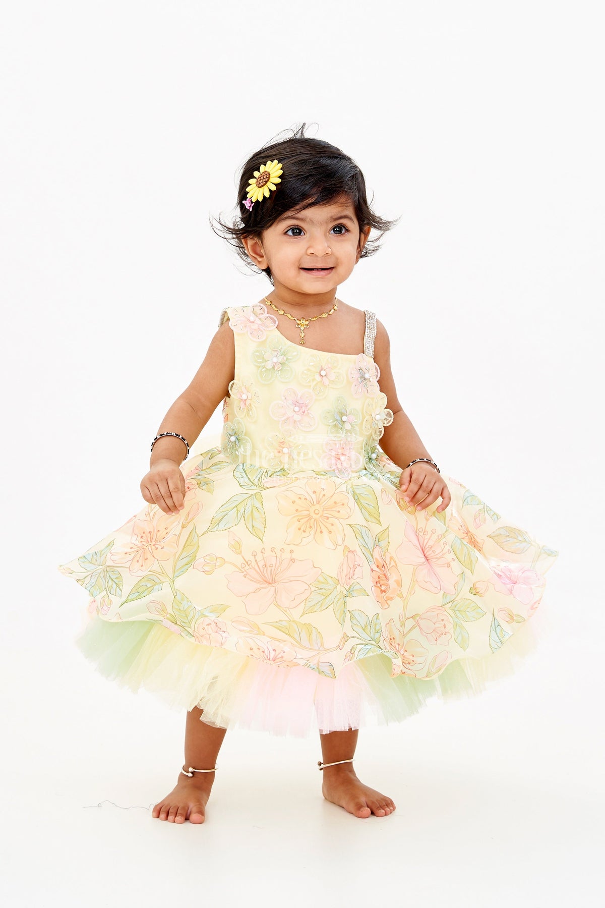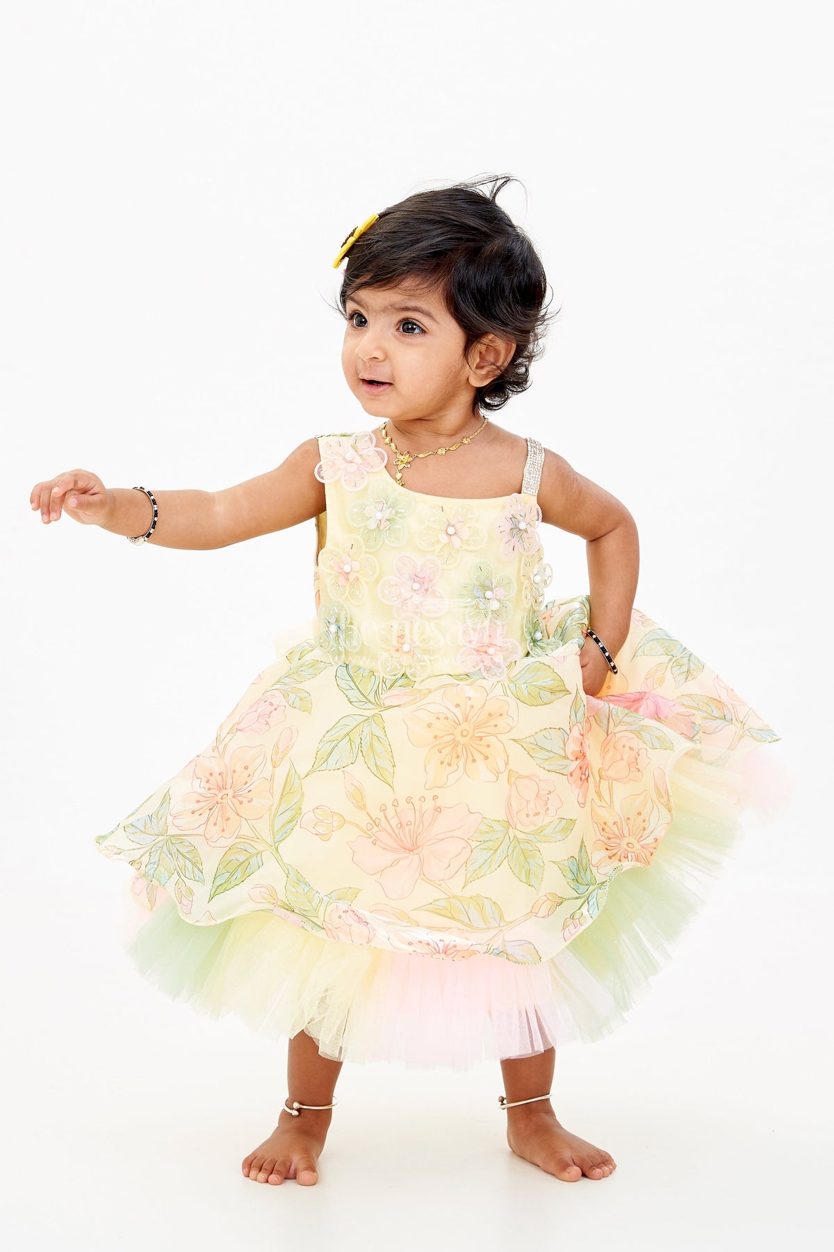 This gown frock is a dreamy and elegant outfit, perfect for special occasions. Crafted from satin organza, this frock features a floral-printed bodice with delicate 3D flower appliqués, adding a touch of sophistication. The multi-layered pastel tulle skirt creates a voluminous and graceful silhouette, making it ideal for twirling. The soft straps ensure a comfortable fit, while the shimmering accents enhance its festive appeal. Whether for birthdays, weddings, or photoshoots, this gown frock will make your little one look like a princess.