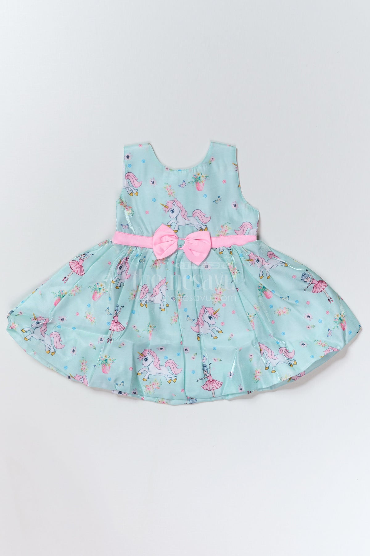 Fancy Party Wear for Baby Girls in Glaza Satin Organza with Unicorn Print and Bow Detail
