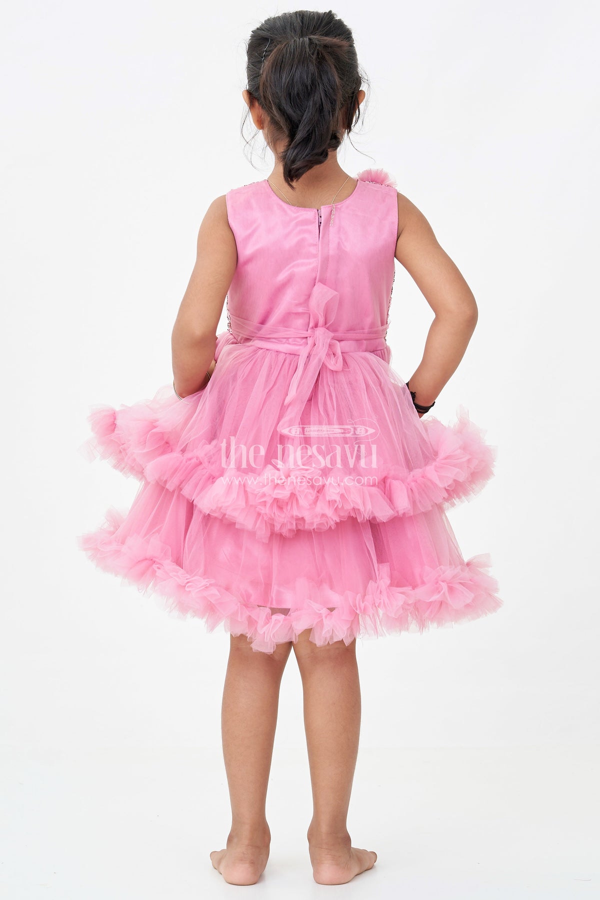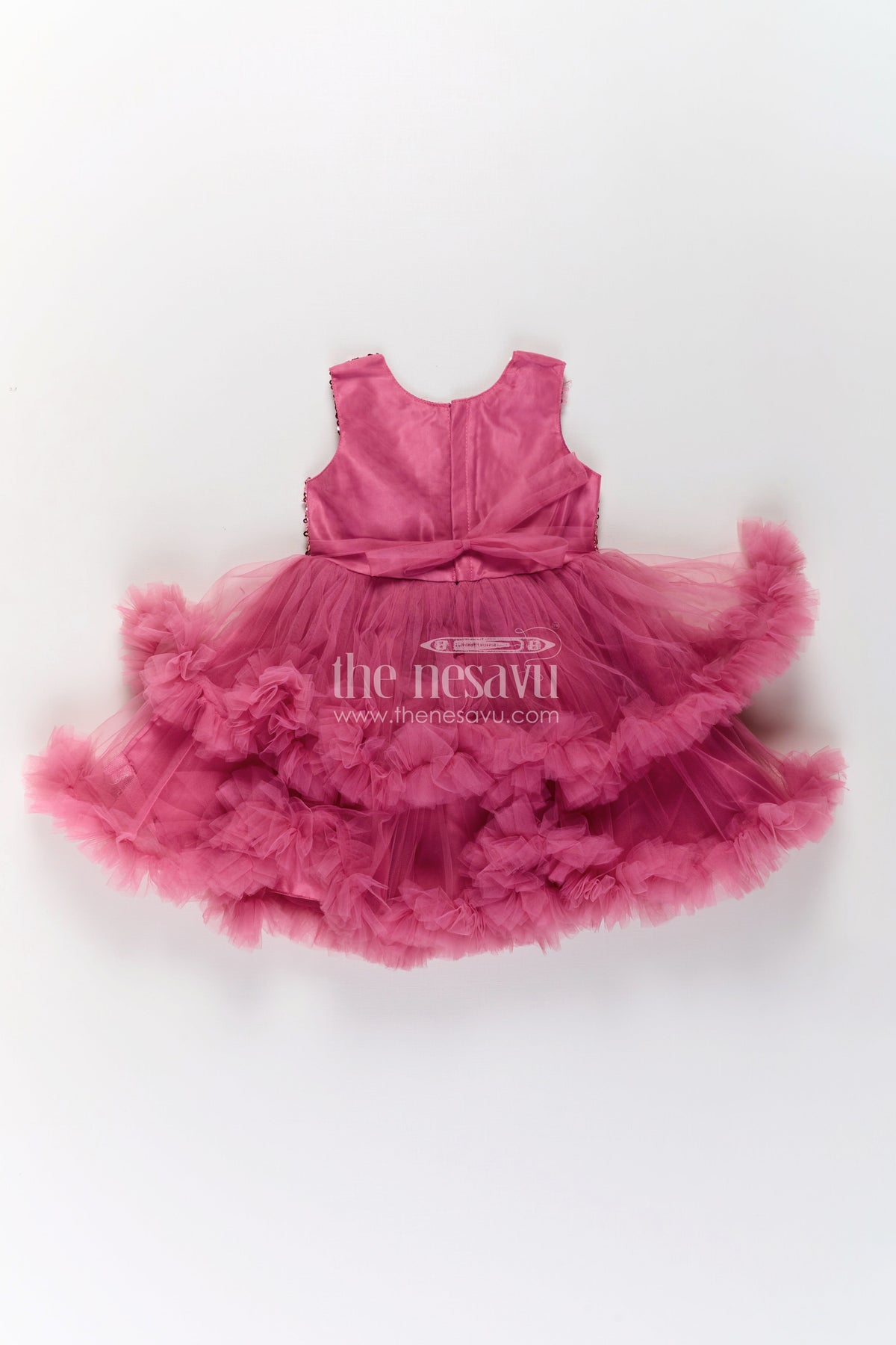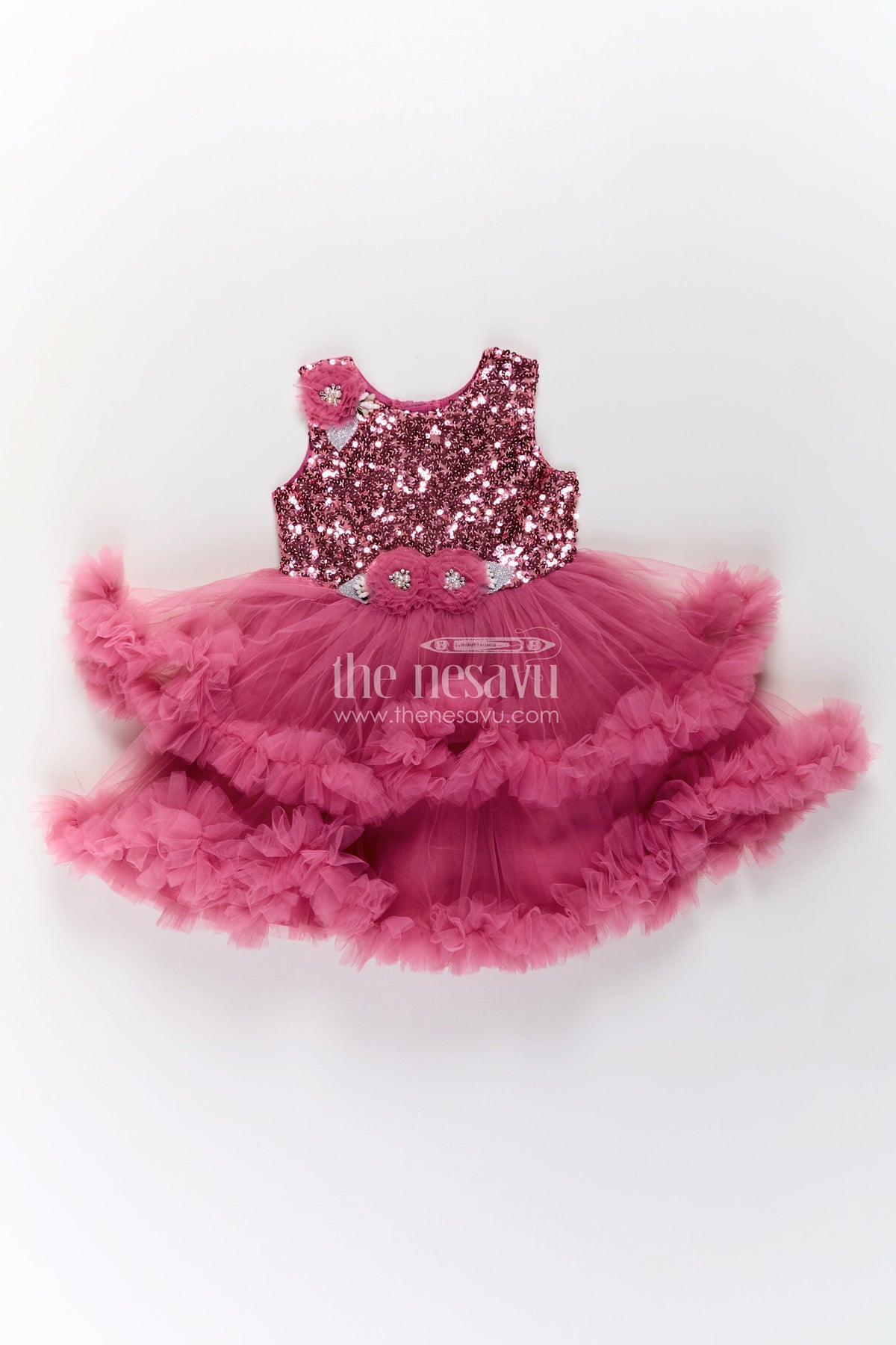 Pink party wear dress by Nesavu is designed for little girls who love to dazzle. Crafted in lightweight plain net, the dress features a stunning sequin-embellished yoke and voluminous frill layers for a twirl-worthy look. Delicate floral appliques and a bow at the waistline add to its charm. Ideal for birthdays, festive events, or dress-up days, this frock combines sparkle and softness, offering comfort with a princess-perfect finish that your child will adore.