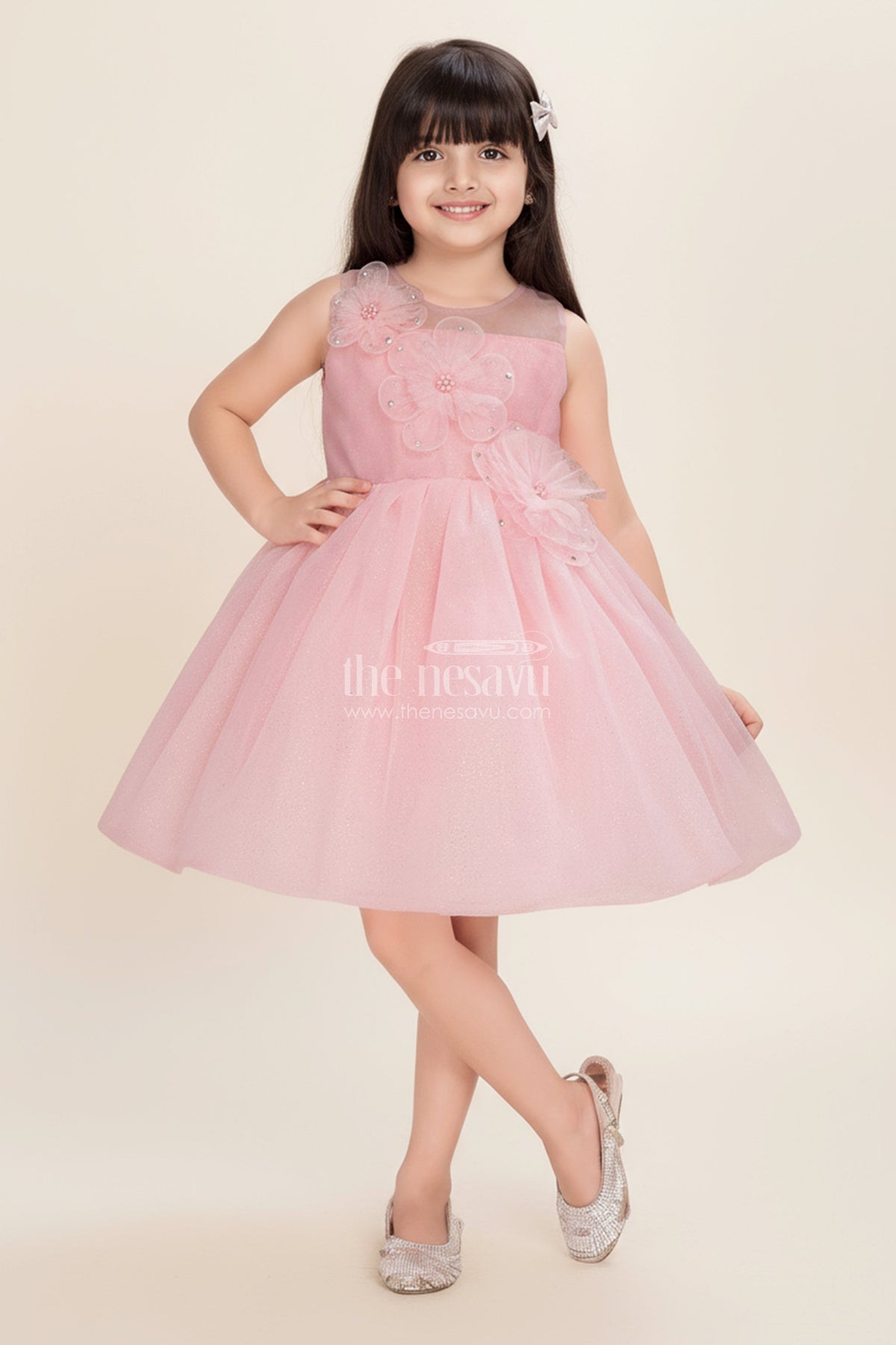 Tulle Party Frock for Girls is the ultimate dress for magical celebrations and picture-perfect moments. This beautiful soft pink frock features a layered tulle overlay dusted with fine shimmer, adding a sparkling finish that glows with every movement. At the bodice, oversized floral appliqués and delicate bead embellishments offer a fairytale-inspired touch, making it an instant favorite for birthdays and party appearances. Crafted for comfort and beauty, the frock includes a soft lining and a wide flare skirt that allows your little one to twirl with joy. The sleeveless design and back zip closure provide ease of wear while maintaining a dreamy silhouette. This is a must-have dress for any little girl who loves to sparkle.