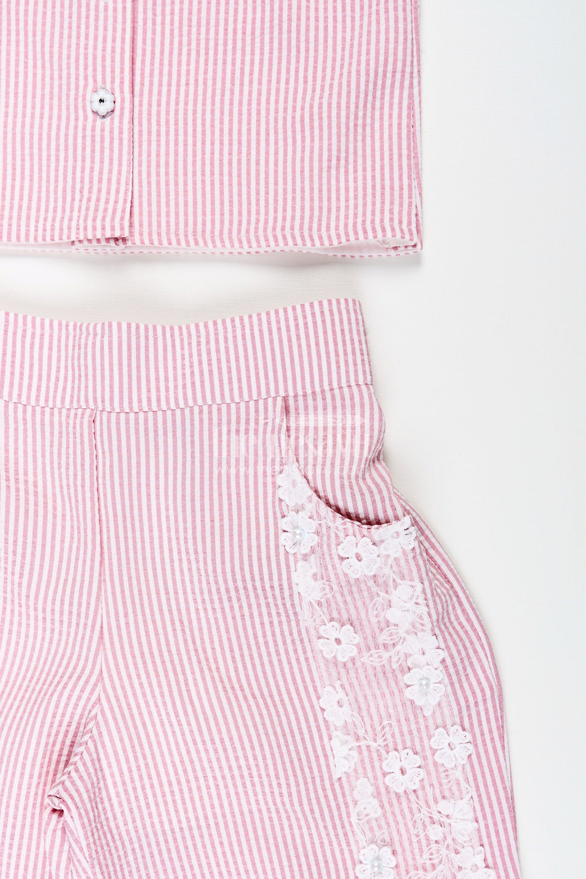 - Delicate white floral lace trim on sleeves and pants