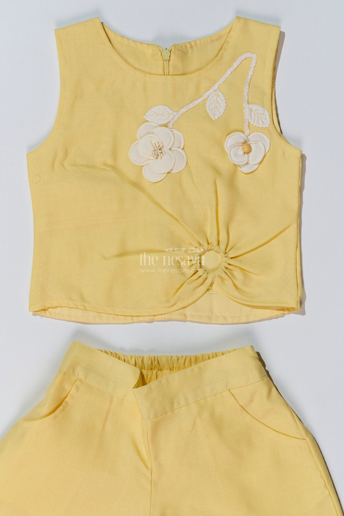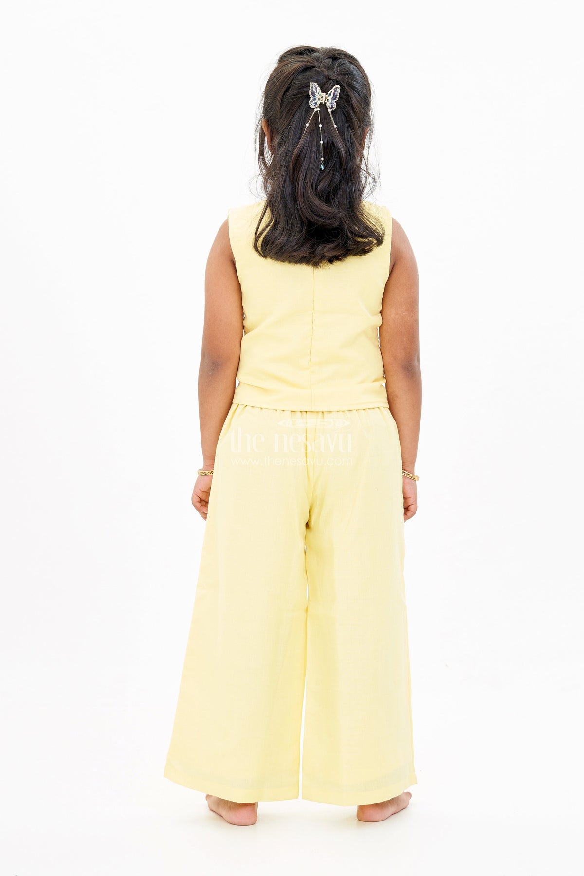 This trendy casual summer outfit for girls is a stylish yet comfortable ensemble designed for warm-weather outings. Crafted from a soft linen blend, the sleeveless crop top features a unique ruched detail at the waist and elegant floral appliqué for a charming touch. Paired with matching wide-leg plazo pants adorned with subtle floral embroidery, this outfit ensures breathability and ease of movement. Whether for a casual day out, vacations, or playdates, this chic set is perfect for staying cool and stylish all summer long.