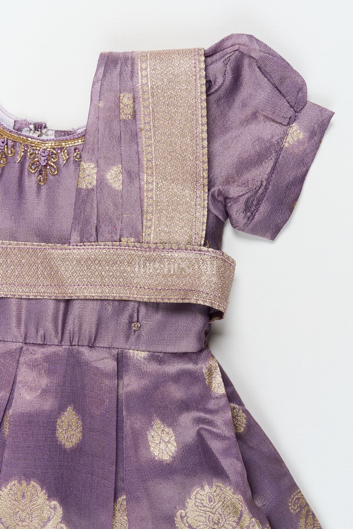 • Design: Zari woven motifs, pleated flare, dupatta-style sash