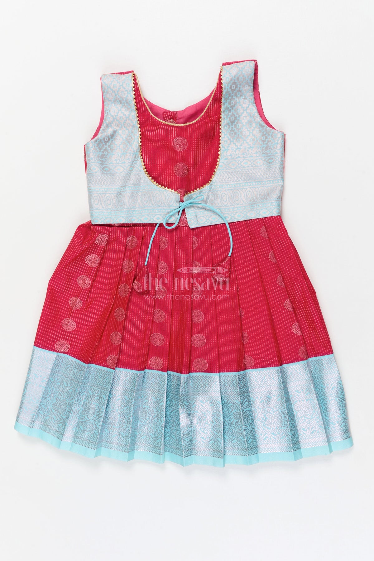 The Nesavu Girls Kanchi Silk Frock Baby Girl Silk Frock for Cultural Events and Festive Photo Moments Nesavu 22 (4Y) / Red / Style 2 KSF030AB-22 Nesavu baby girl silk frock with zari border and tie-up overlay for festive family occasions