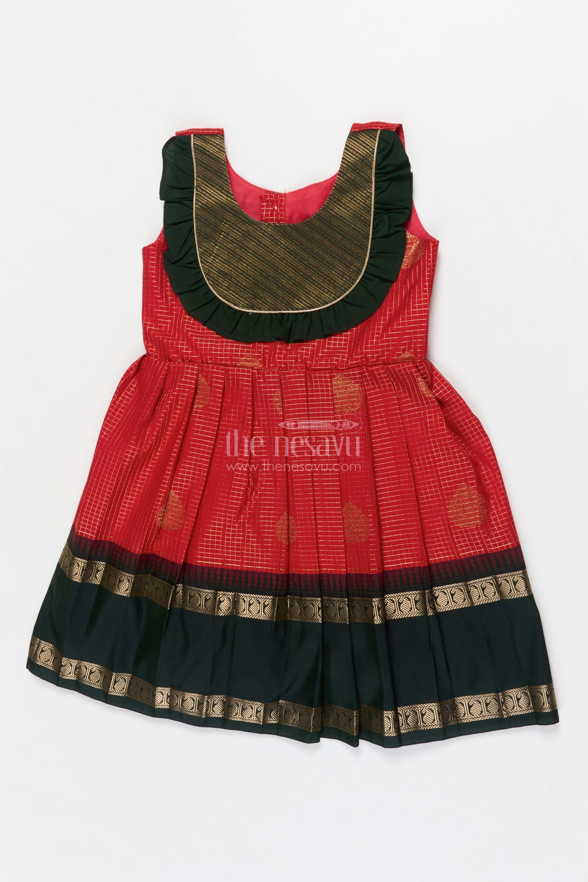 • Design: Zari checks, pleated skirt, traditional border, frilled contrast bib yoke