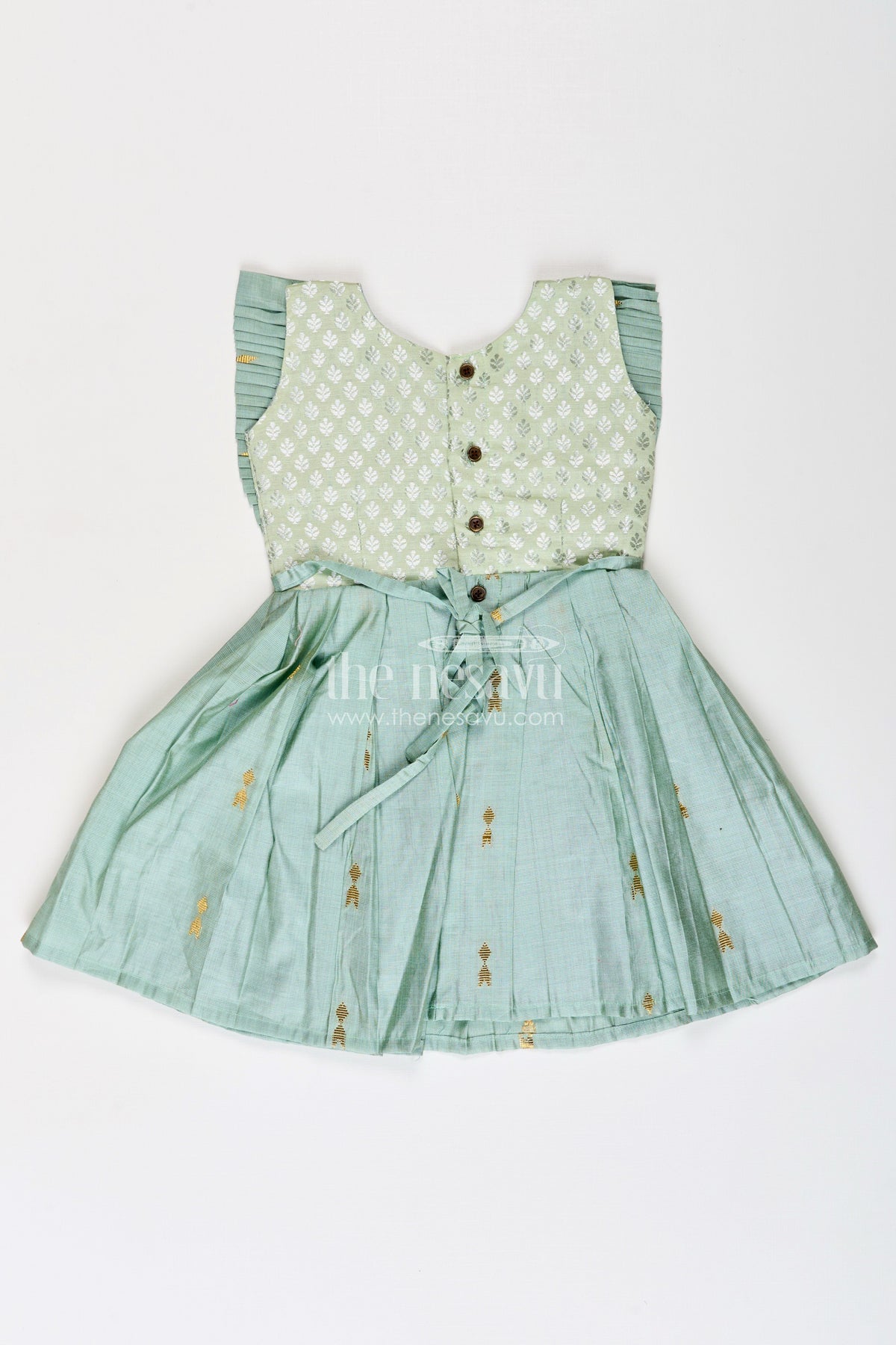 Pattu long frocks designs are reimagined in this beautiful green frock for girls, featuring soft viscose fabric and a richly woven semi Banaras yoke. Gold zari motifs subtly enhance the skirt, which is finished with neat vertical pleats for a flowy, structured look. The pleated neckline adds extra dimension to the yoke, offering elegance while ensuring comfort. Perfect for special ethnic events, this frock is the right mix of tradition and kid-friendly style, providing both grace and ease for everyday festive wear.
