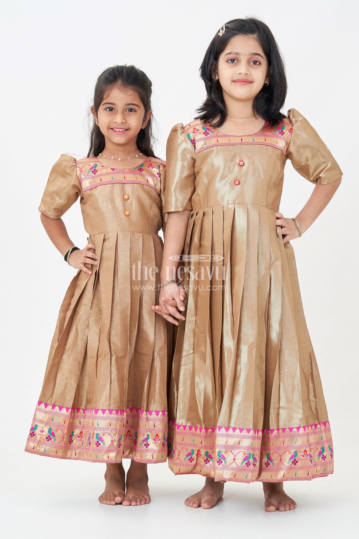 Yellow gold gown for girls from Nesavu is a beautiful blend of cultural opulence and modern tailoring. This stunning gown is crafted from golden-toned tissue silk and highlighted with a vibrant Paithani border at the hem, bringing festive radiance to life. The short-sleeved design and neatly pleated skirt offer ease of movement and a regal silhouette. Designed for traditional occasions, weddings, and temple visits, this gown ensures comfort through breathable fabric while delivering a heritage-inspired look. The shimmering finish and intricate detailing make this a memorable outfit for special moments.