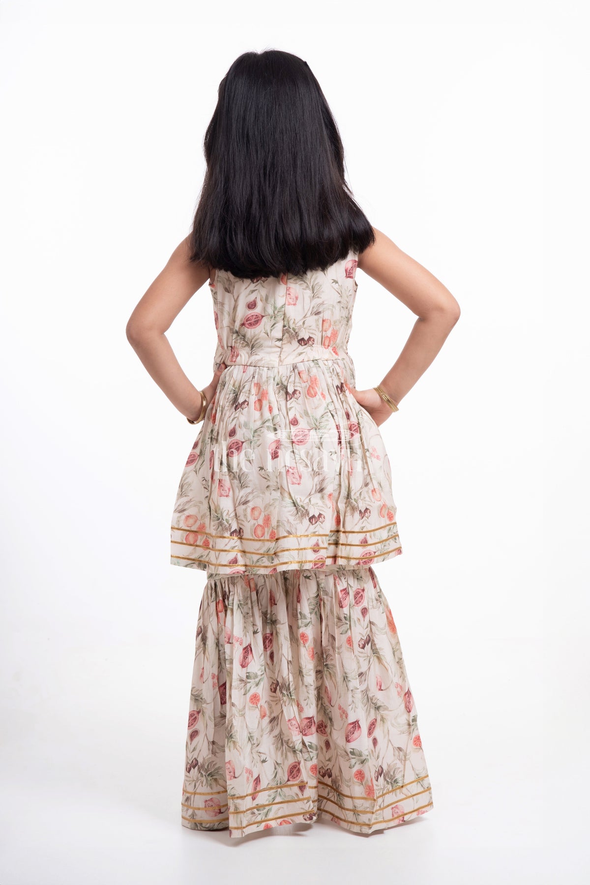 Celebrate Diwali and Navratri in style with this elegant Nesavu Modal Silk Kurti and Sharara Outfit for girls. Featuring a sophisticated floral print and intricate hand embroidery, this outfit is perfect for making your little one stand out during festive occasions. Available in sizes for girls aged 1 to 10 years.
