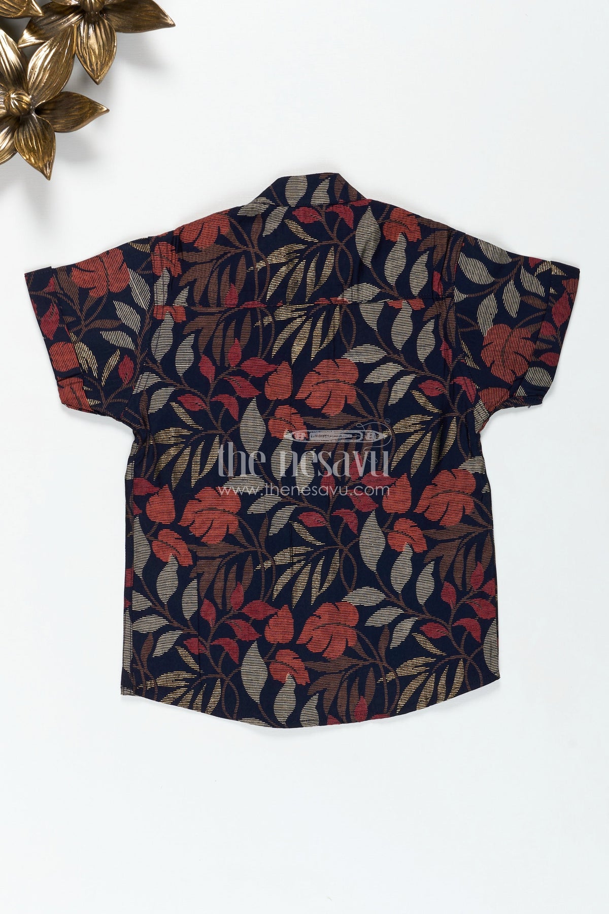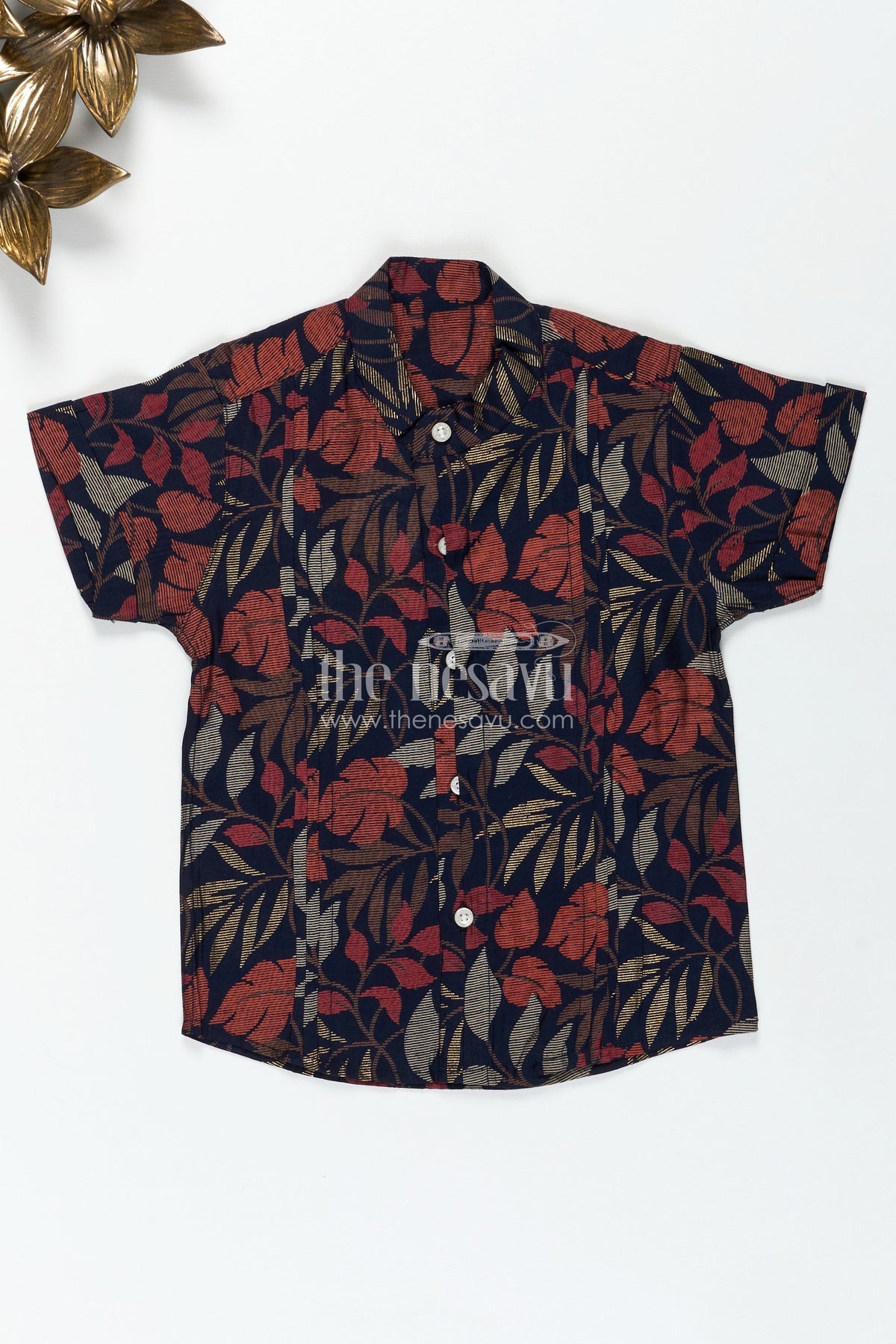 The Nesavu Boys Cotton Shirt Boys Half Sleeve Shirt for Cultural Events with Earthy Leaf Print in Soft Modal Silk Fabric Nesavu Nesavu Boys Half Sleeve Modal Silk Shirt Leaf Print Cultural Functions Festive Comfort