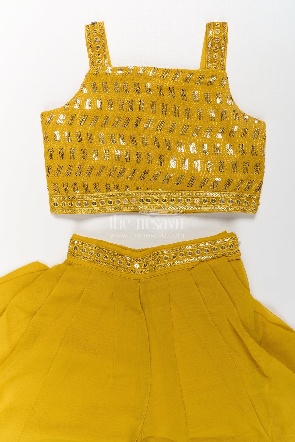 This trendy dhoti style palazzo set in mustard yellow is a beautiful balance of ethnic charm and modern flair. Crafted from breathable georgette, it features a flowy dhoti-style palazzo bottom paired with a sleeveless embroidered crop top. The standout feature is the coordinated dupatta, adorned with shimmering stripes and playful tassels for added flair. Ideal for festive occasions and cultural functions, this outfit brings comfort and elegance together, letting your little one shine in every setting.