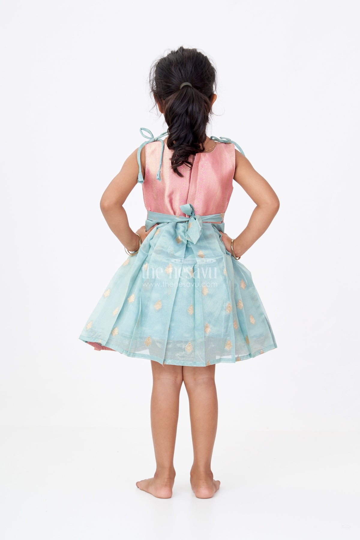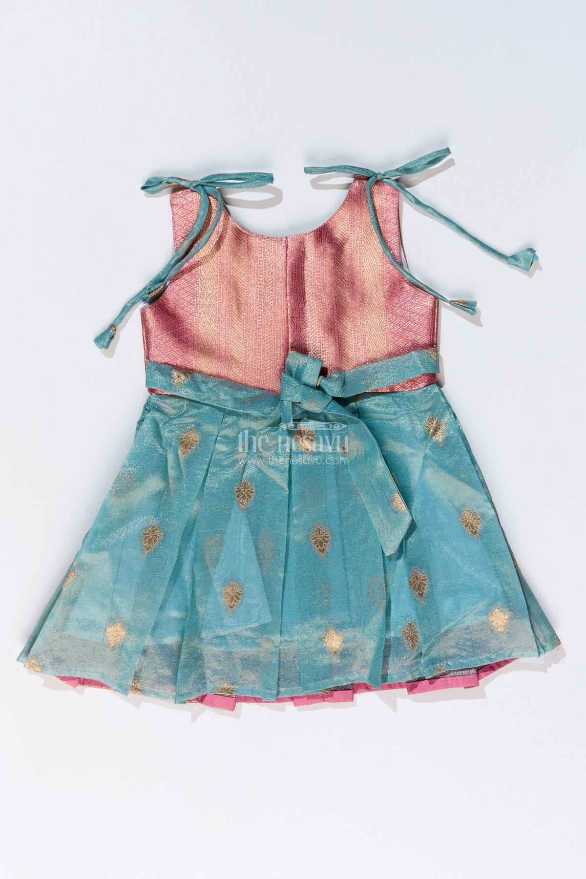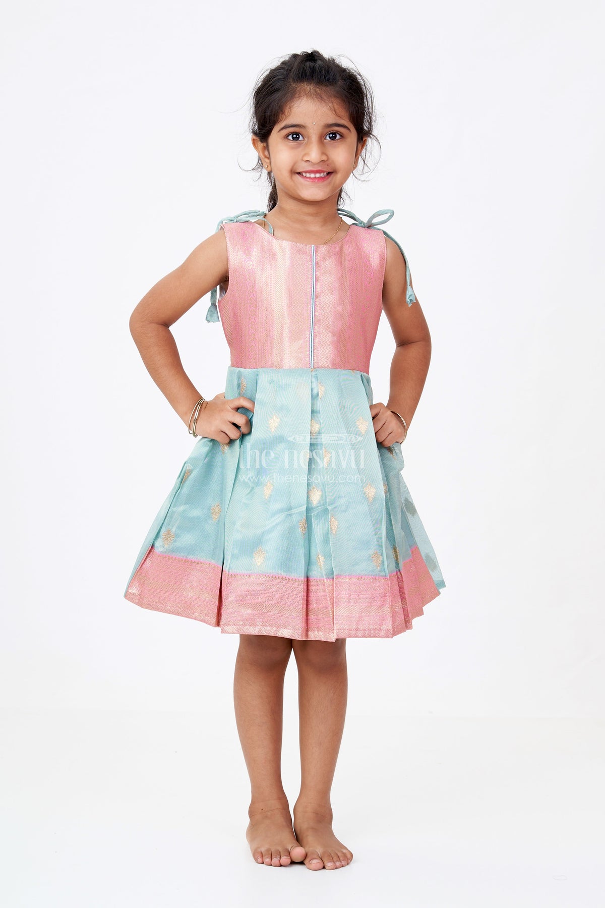 This stunning soft silk frock is the perfect blend of tradition and modern charm. Crafted from a luxurious gold tissue Banarasi jacquard silk blend, this dress features a striking dual-tone design in green and pink, enriched with delicate gold zari motifs. The sleeveless cut and back tie-up detailing ensure a comfortable yet elegant fit, while the pleated skirt enhances its regal appeal. Ideal for festive occasions, weddings, and cultural celebrations, this dress offers a graceful silhouette and breathable comfort, making it a must-have for your little fashionista’s wardrobe.