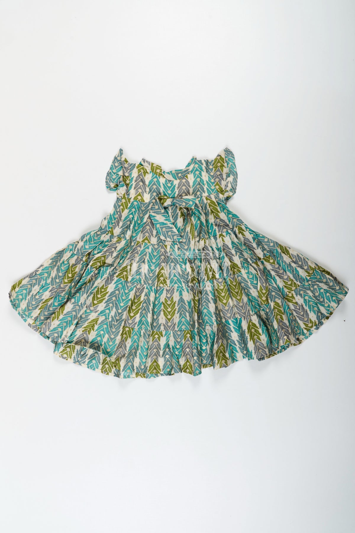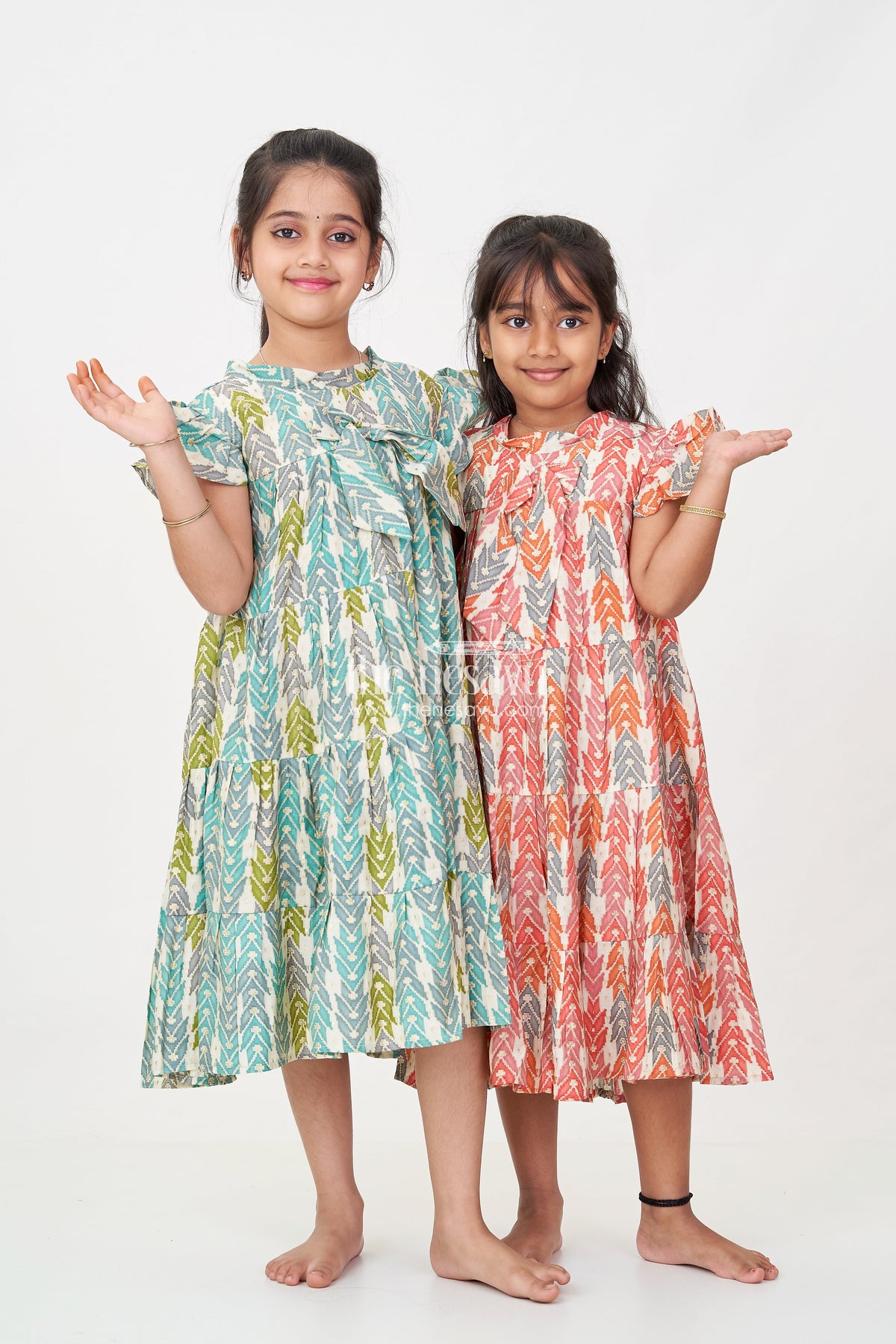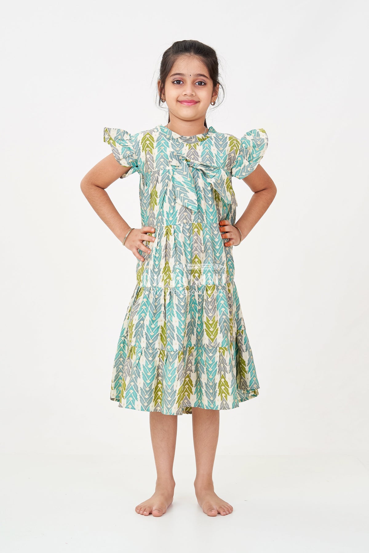 This green colour frock for girls features an eye-catching digital print in a combination of greens, teals, and neutrals—perfect for fun days out. Made from soft modal silk fabric, the frock is designed with a relaxed fit and tiered layers that allow free movement. A cute front bow adds charm to the bodice, while ruffled cap sleeves bring a playful and girly touch. Ideal for everyday adventures or playdates, this frock strikes the perfect balance between comfort and style.