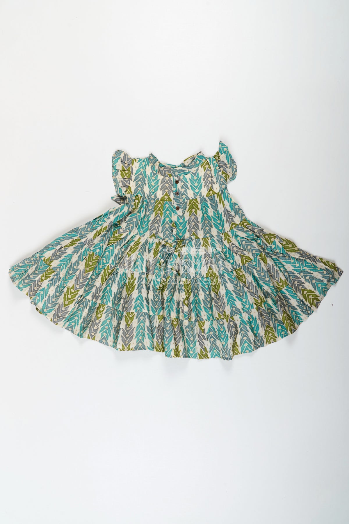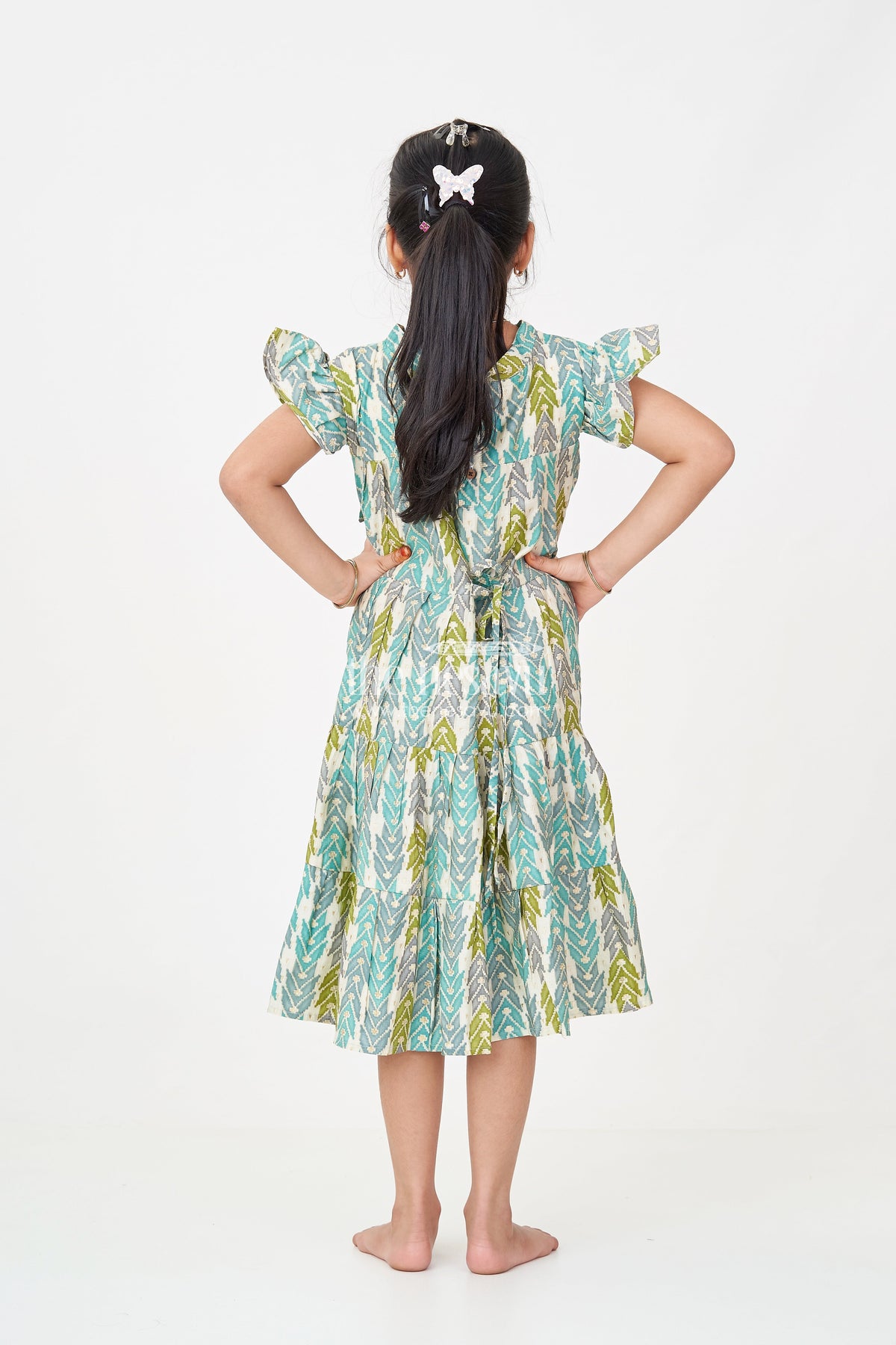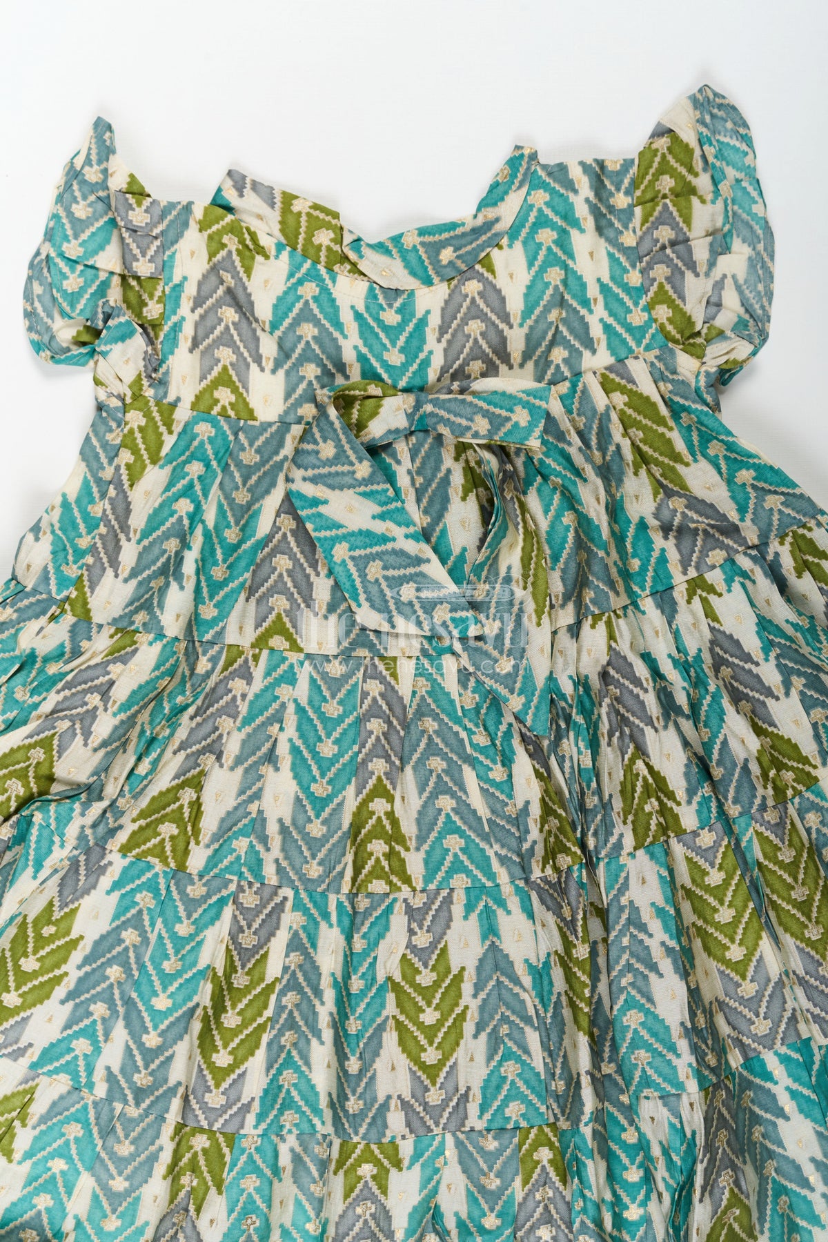 This green colour frock for girls features an eye-catching digital print in a combination of greens, teals, and neutrals—perfect for fun days out. Made from soft modal silk fabric, the frock is designed with a relaxed fit and tiered layers that allow free movement. A cute front bow adds charm to the bodice, while ruffled cap sleeves bring a playful and girly touch. Ideal for everyday adventures or playdates, this frock strikes the perfect balance between comfort and style.
